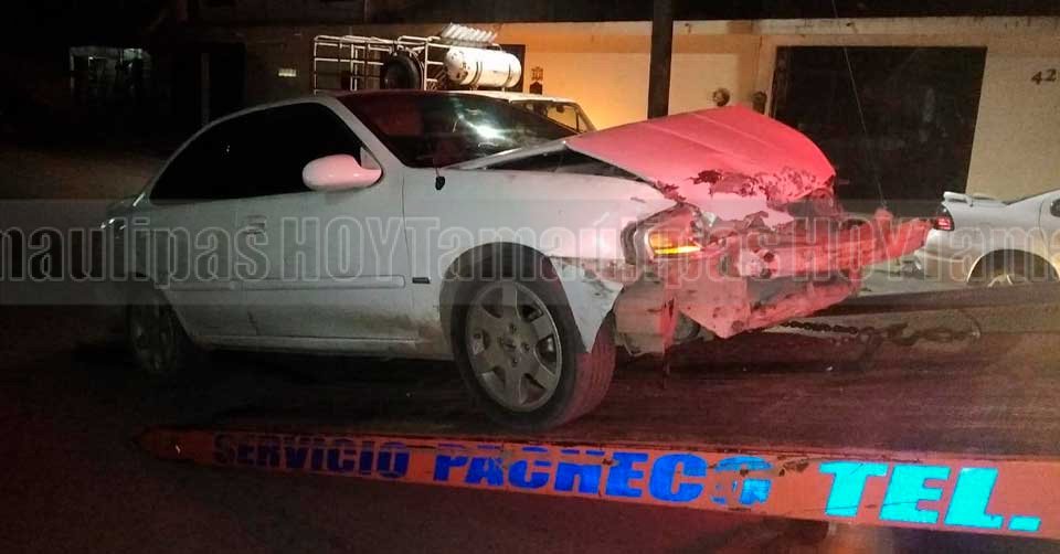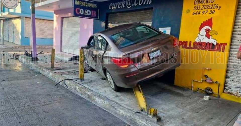 Automóvil Chevrolet Cavalier color café con placas de Tamaulipas terminó con severos daños tras impactarse contra un negocio en Tampico