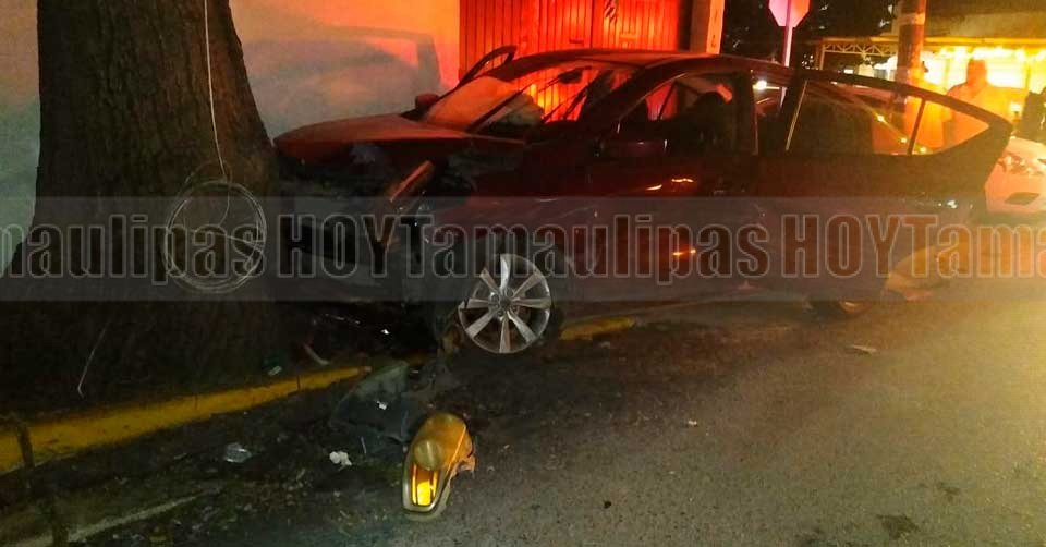 Automóvil con severos daños luego de haberse impactado contra un árbol en Ciudad Victoria