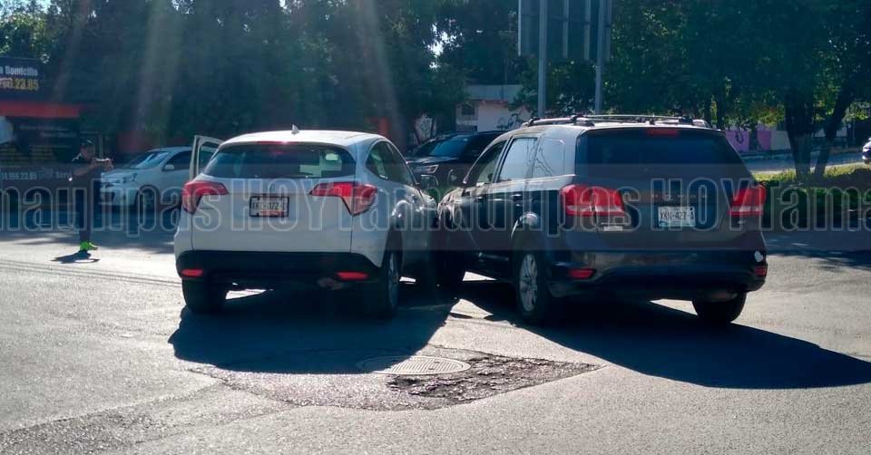 Camioneta Honda blanca y una camioneta Dodge Journey luego de haber chocado en Ciudad Victoria