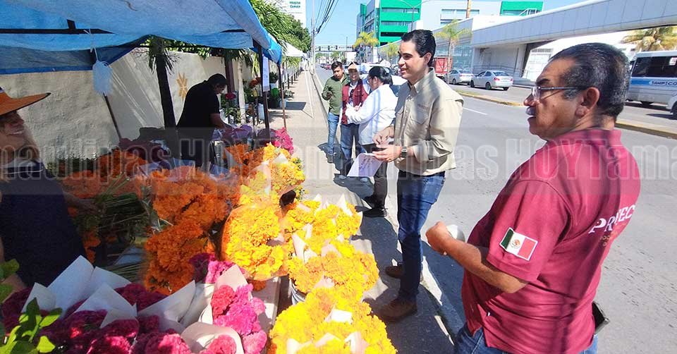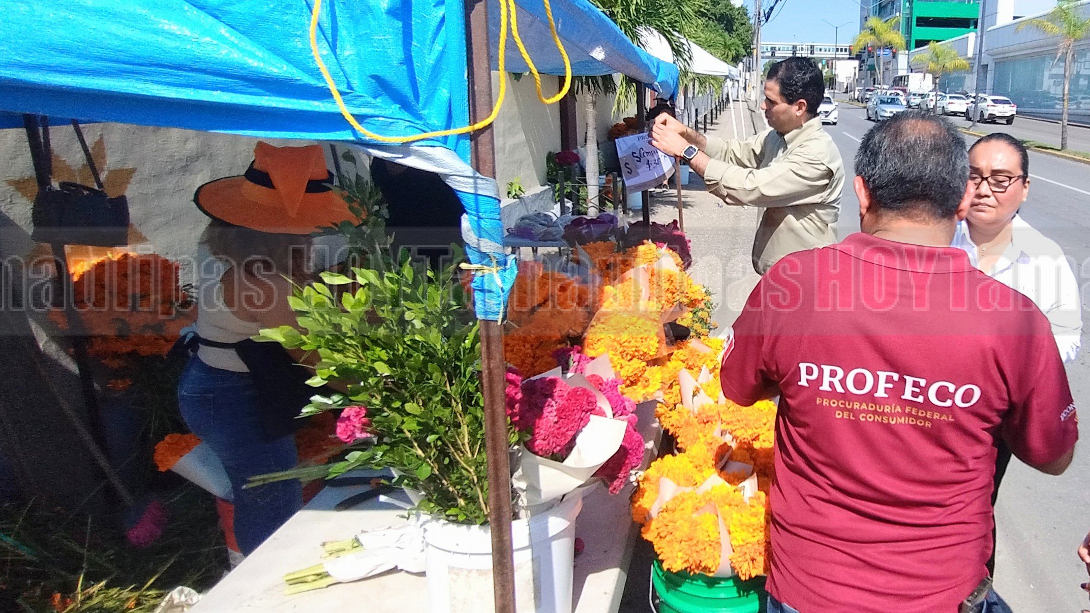 Personal de Profeco coloca preciadores en un puesto de venta de flores en Tampico, como parte del operativo de verificación por el Día de Muertos