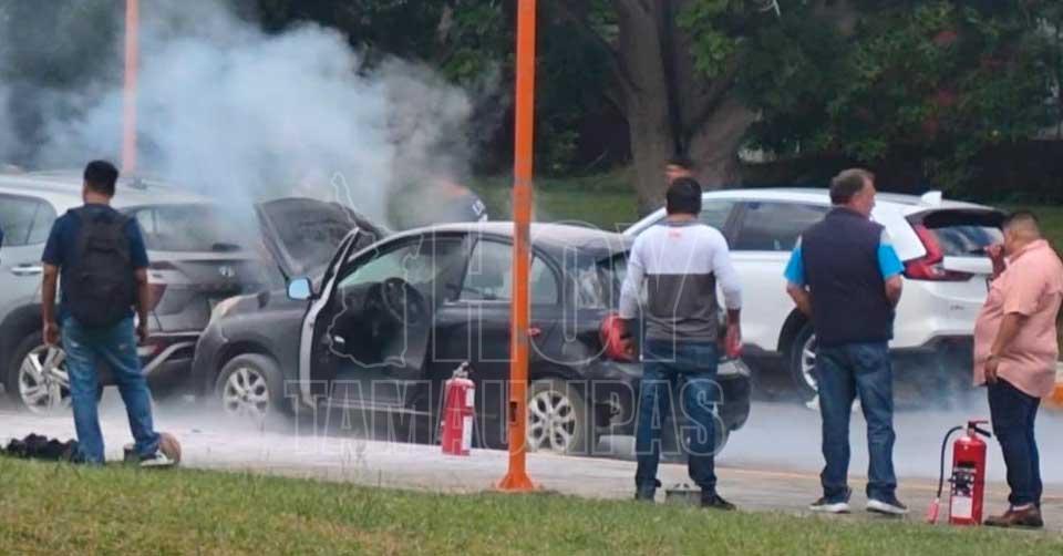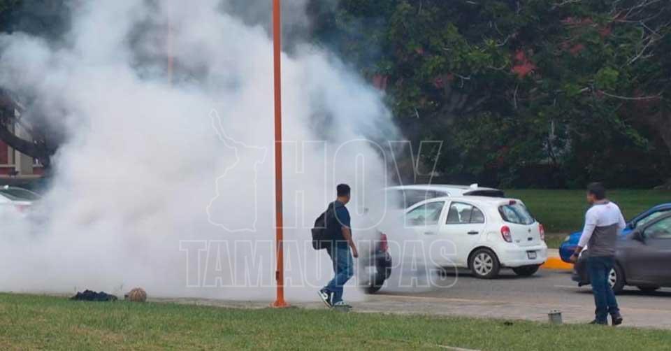 Intensa estela de humo salir de un automóvil que era apagado por los bomberos al incendiarse en el interior de la UAT, campus Tampico-Madero