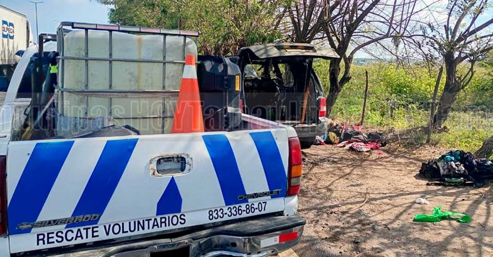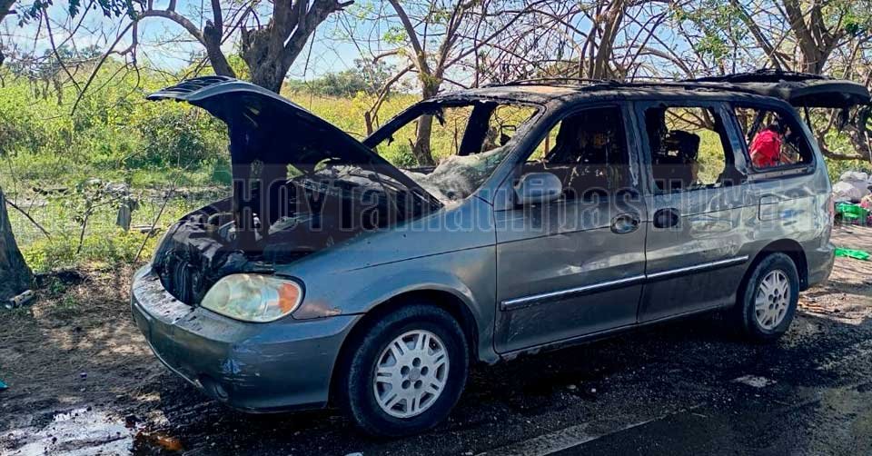 Camioneta tipo mini-van que transportaba ropa luego de incendiarse mientras circulaba sobre la Avenida de la Industria en Altamira