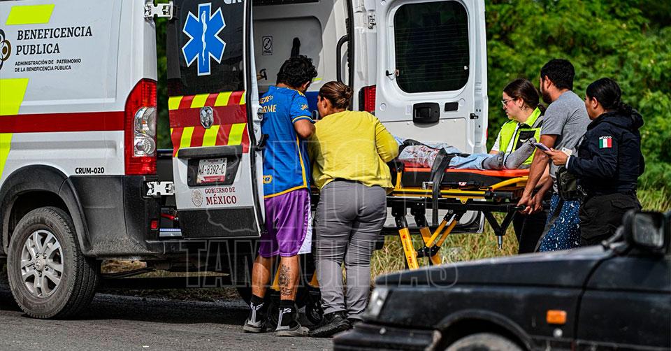 Paramédicos atendiendo a un joven motociclista luego de resultar lesionado al chocar contra una camioneta en Ciudad Victoria