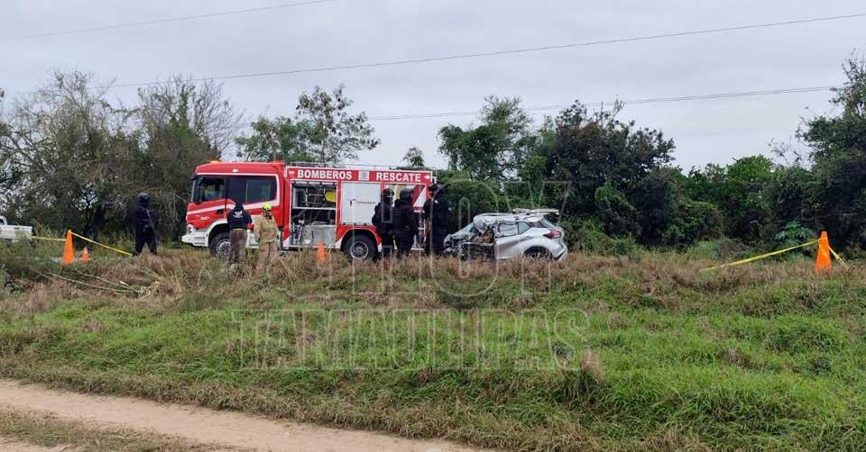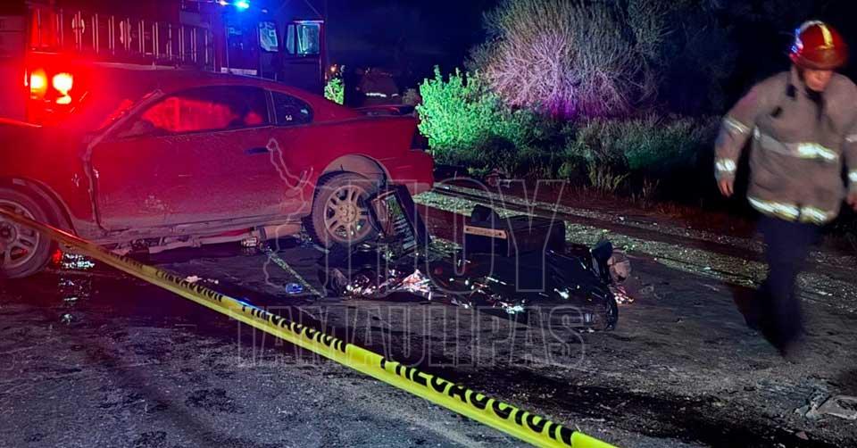 Cuerpo de Bomberos observando un automóvil con severos daños en la parte frontal luego de haber chocado en Matamoros