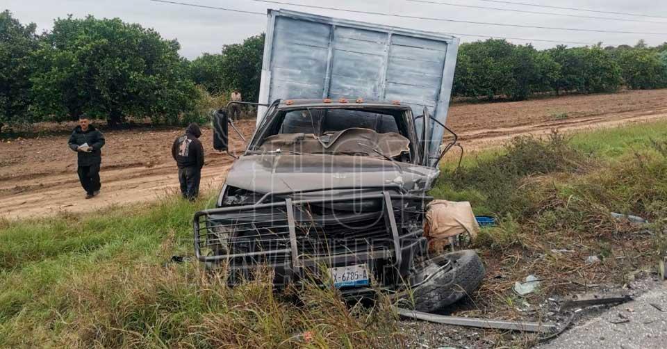 Tractocamión luego de haber volcado en la carretera San Fernando–Reynosa, cerca del Ejido Palos Blancos
