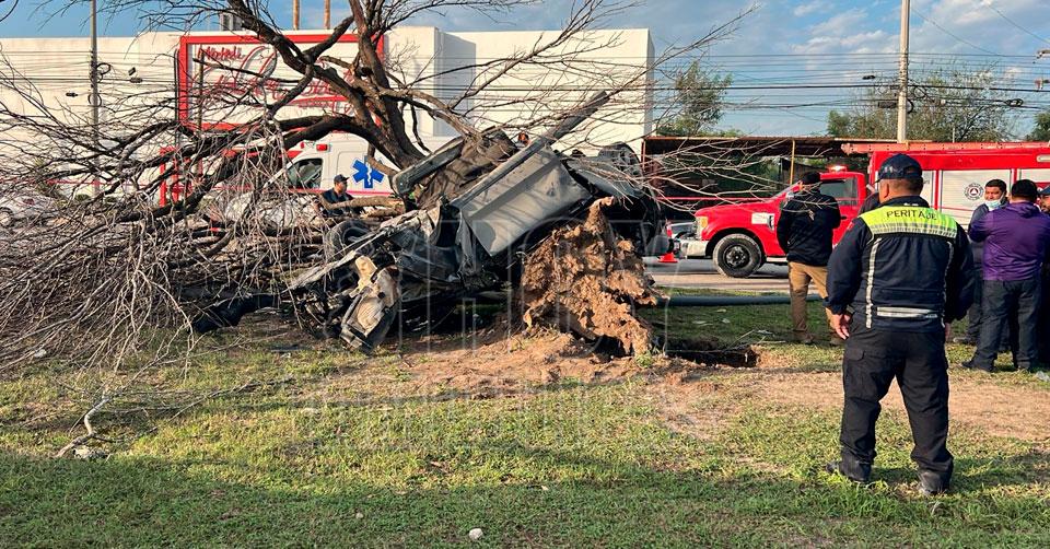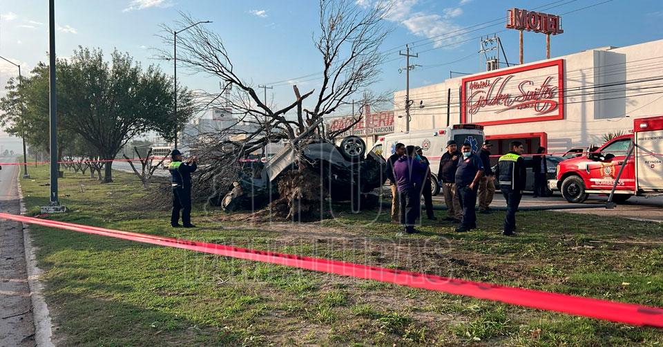 Autoridades y cuerpos de rescate trabajan en el lugar donde un conductor perdió la vida tras impactar y volcar su vehículo en el bulevar Morelos, en Reynosa