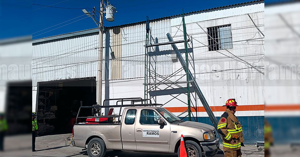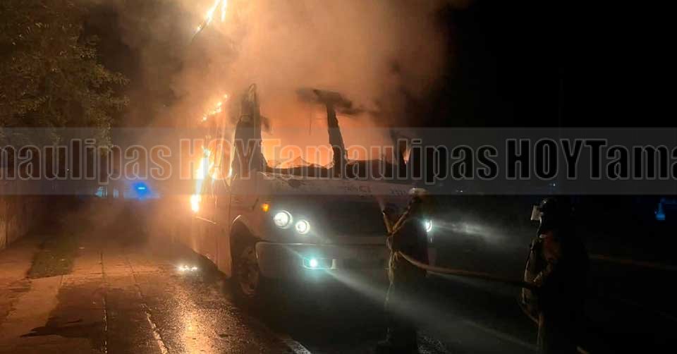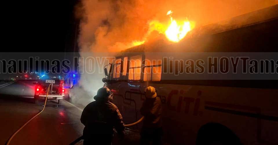 Bomberos apagando el fuego que estaba consumiendo un autobús en Ciudad Victoria