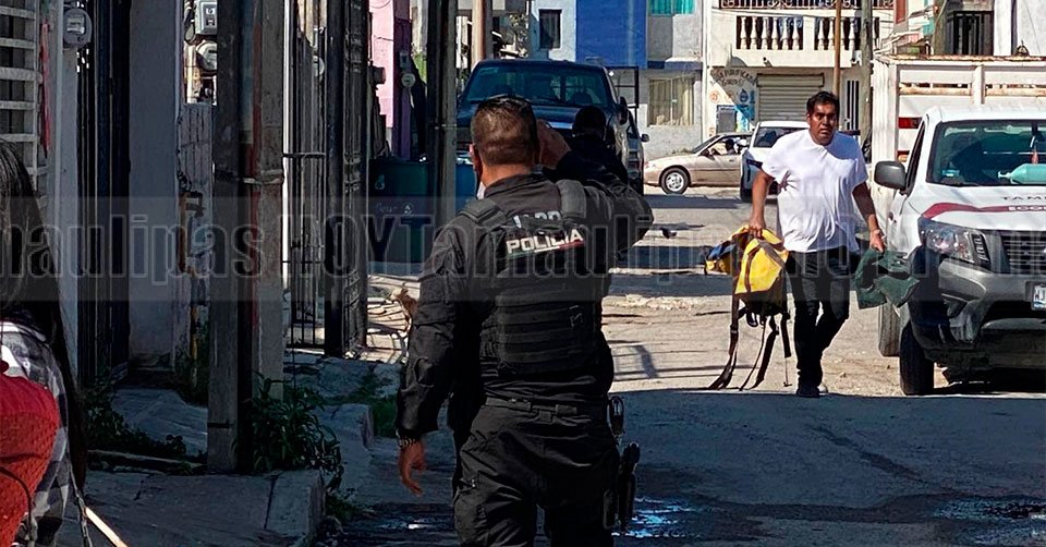 Elementos de Tránsito y Guardia Estatal atendiendo el reporte de una camioneta impactada contra una vivienda en Altamira