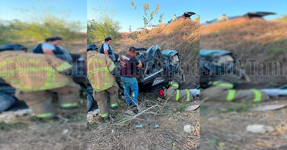 Brigadistas de la base Bomberos Voluntarios de Tamaulipas y otras corporaciones auxilian a una mujer lesionada luego de volcar en Altamira