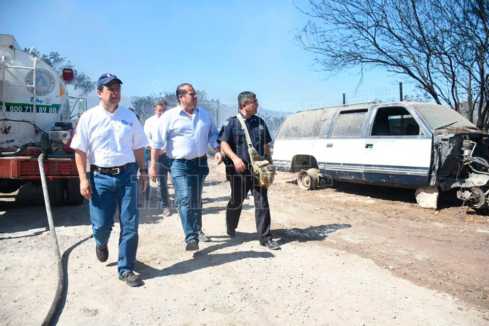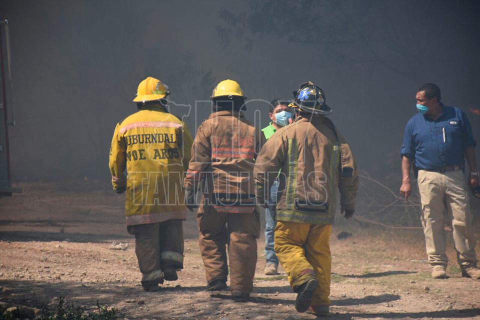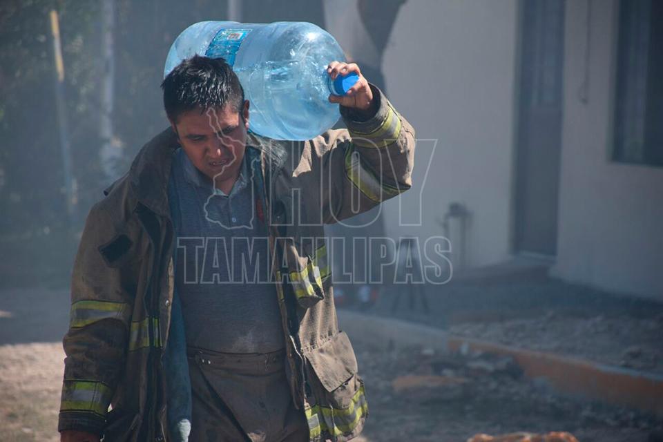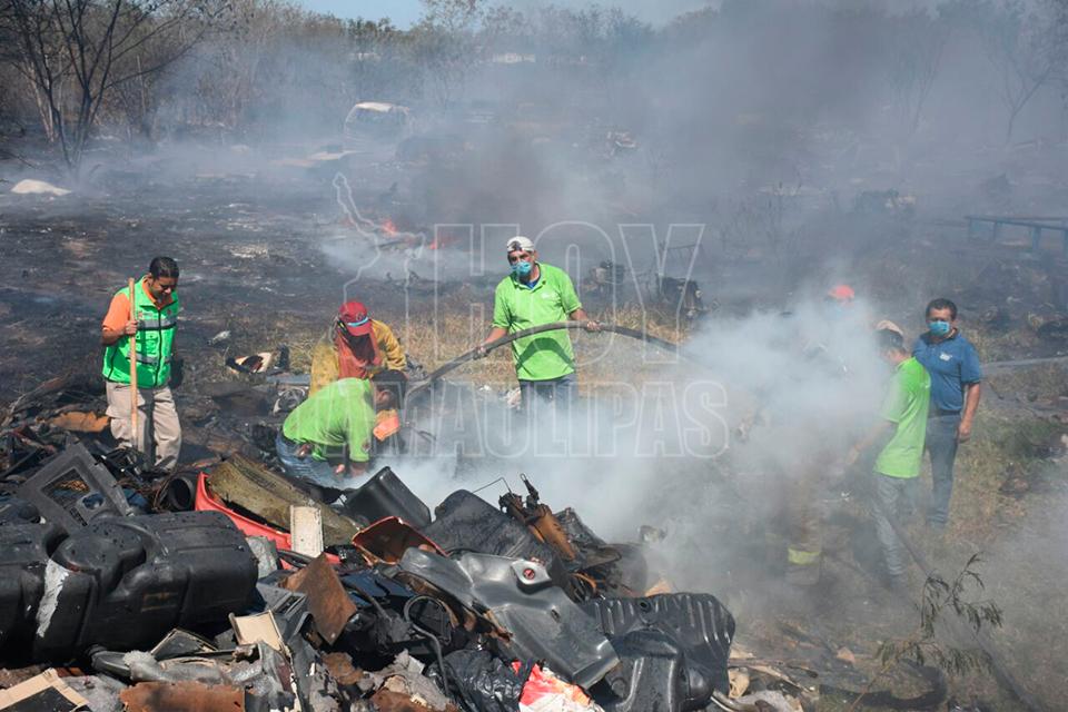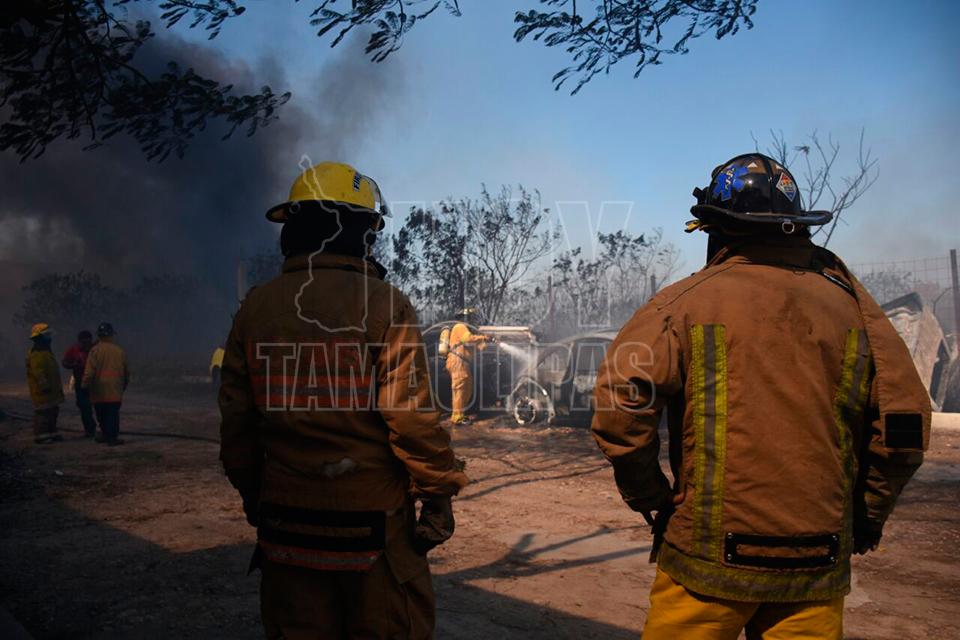 Un fuerte incendio se registra en un yonke de autos ubicado en la colonia Vamos Tamaulipas, cerca del complejo de Seguridad Pública en Ciudad Victoria. Bomberos apagando el fuego con botellones de agua