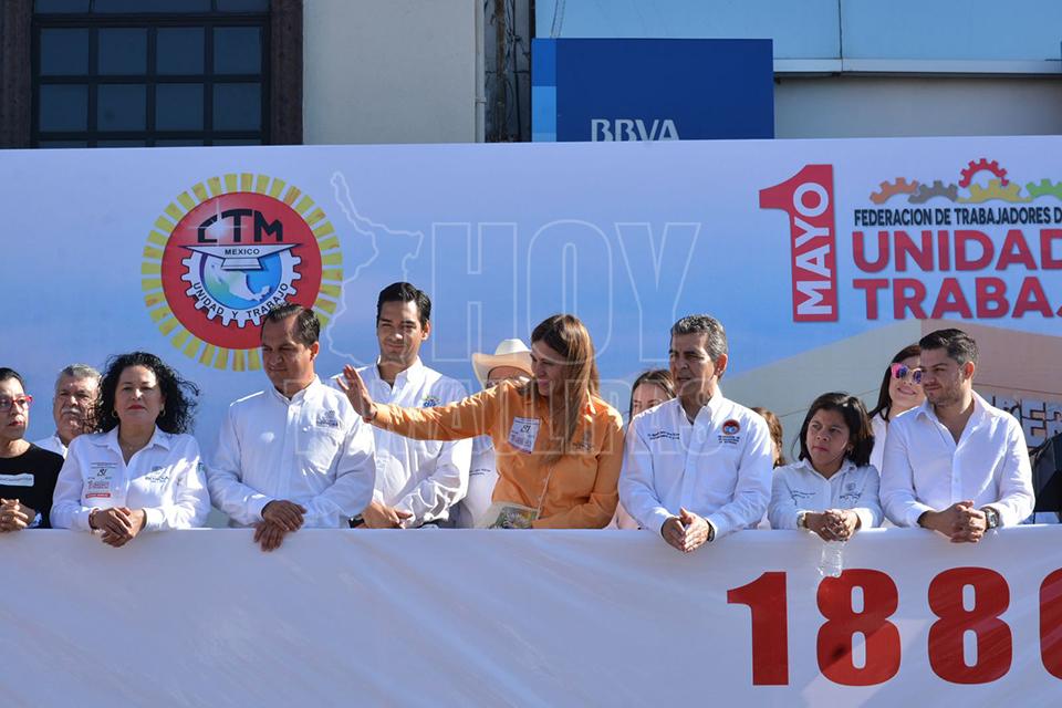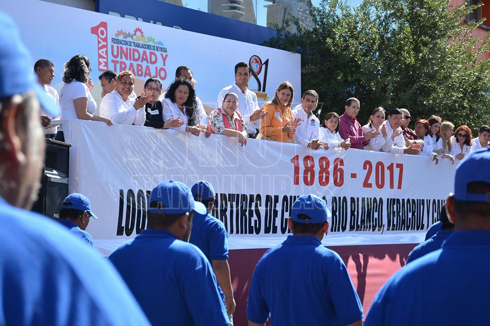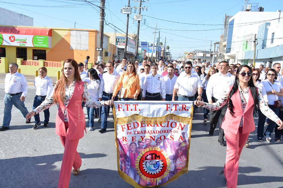 El desfile obrero fue encabezado por el secretario general de la Federación de Trabajadores de Reynosa (FTR) Reynaldo Garza Elizondo y como invitada especial la alcaldesa Maki Ortiz Domínguez.