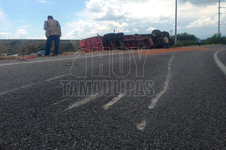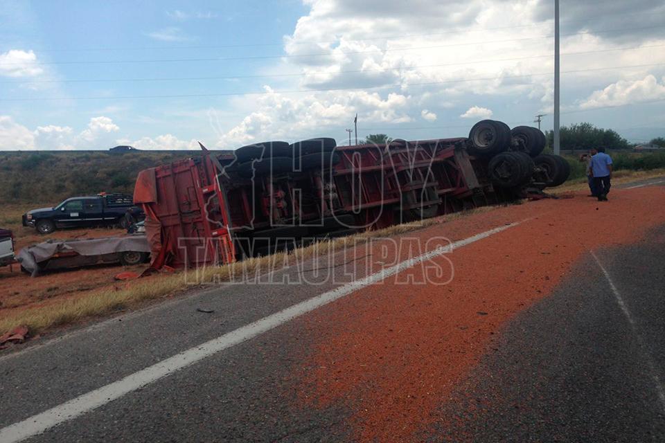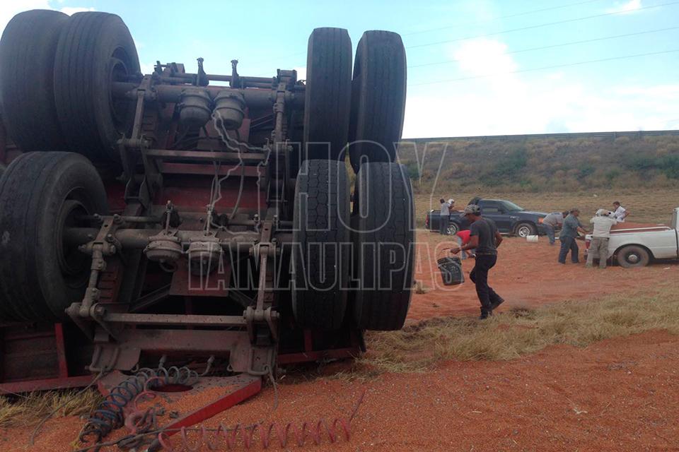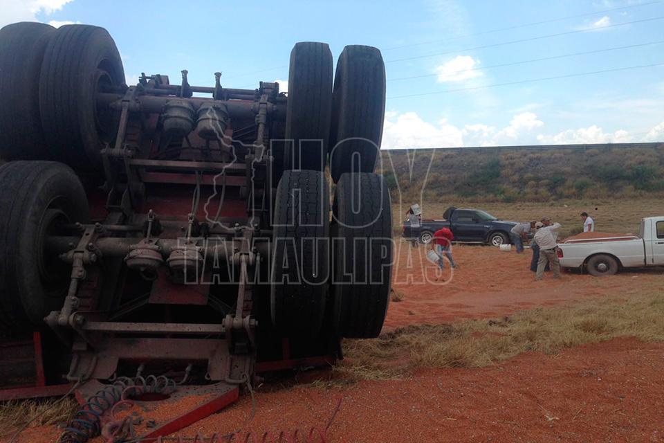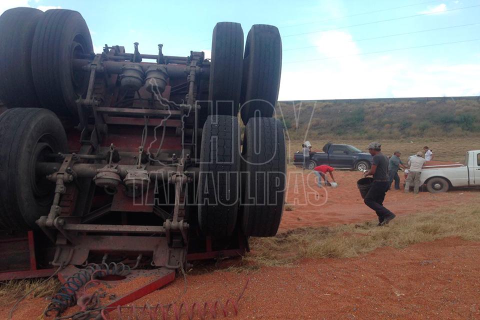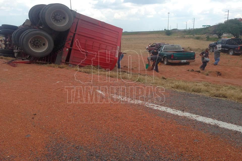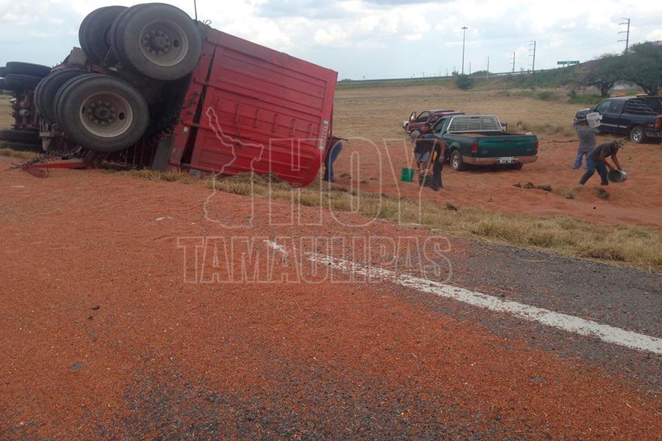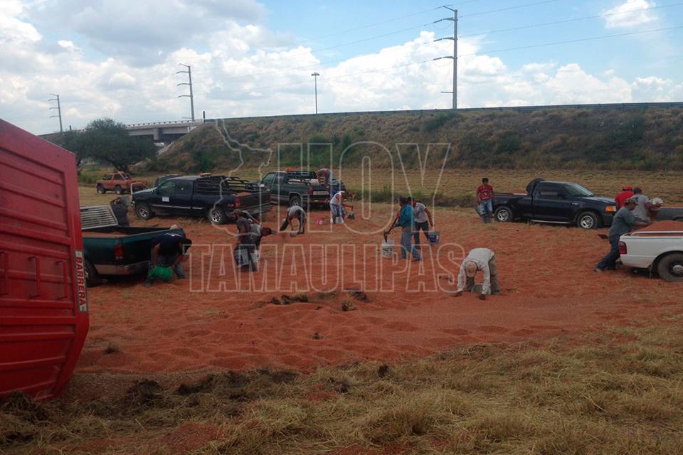 Un remolque con varias toneladas de sorgo se desprendió del tráiler que lo jalaba, quedando la carga regada a un costado de la cinta asfáltica en el entronque de la carretera Zaragoza y Soto la Marina, por lo que los que pasaban por el lugar comenzaron a realizar rapiña,