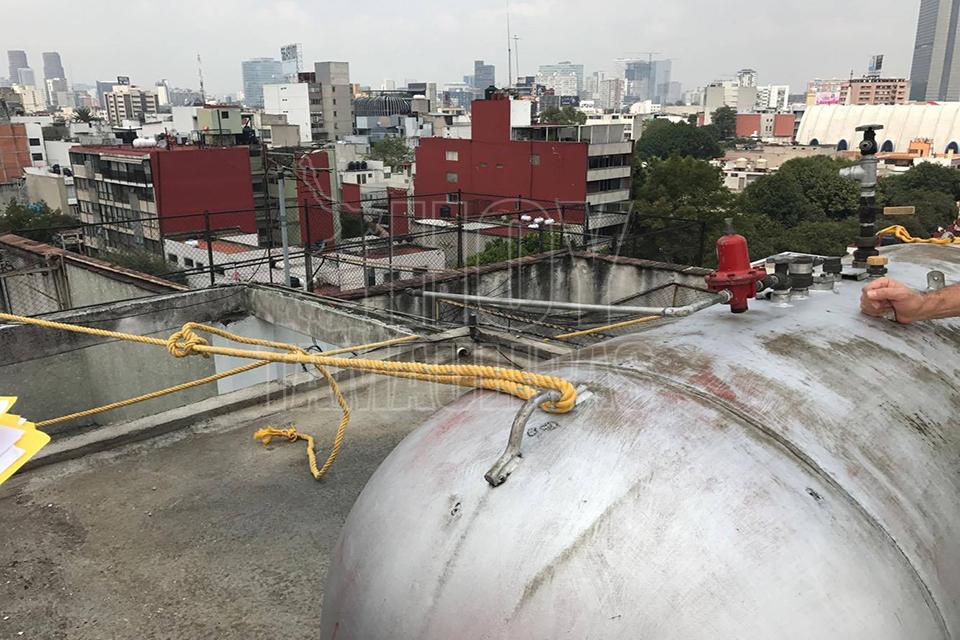A más de una semana del sismo el peligro continúa latente en un edificio de departamentos, debido a un tanque de gas con una capacidad de mil 500 litros que está en la azotea del noveno piso sostenido solo por cuerdas