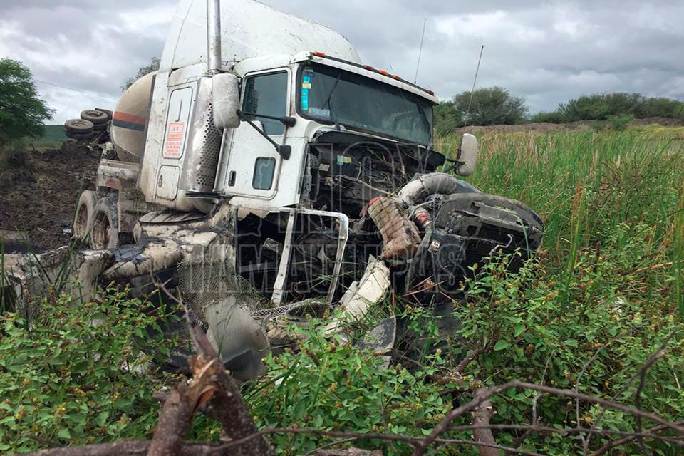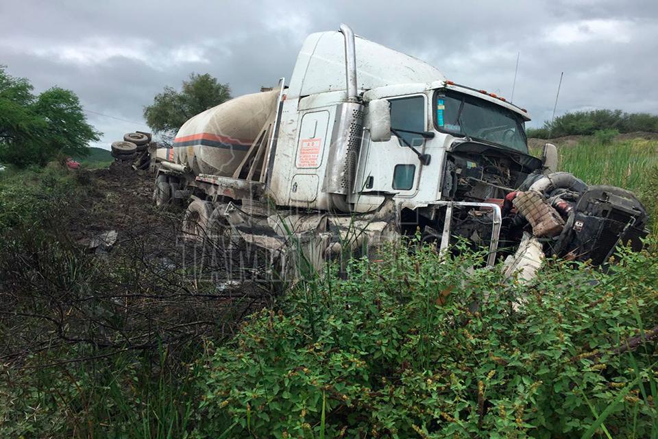 En este percance se vio involucrado un automóvil propiedad del Gobierno del Estado y un tráiler pipa con doble remolque, mismo que después del impacto salió proyectado de la superficie de rodamiento y terminó volcado.