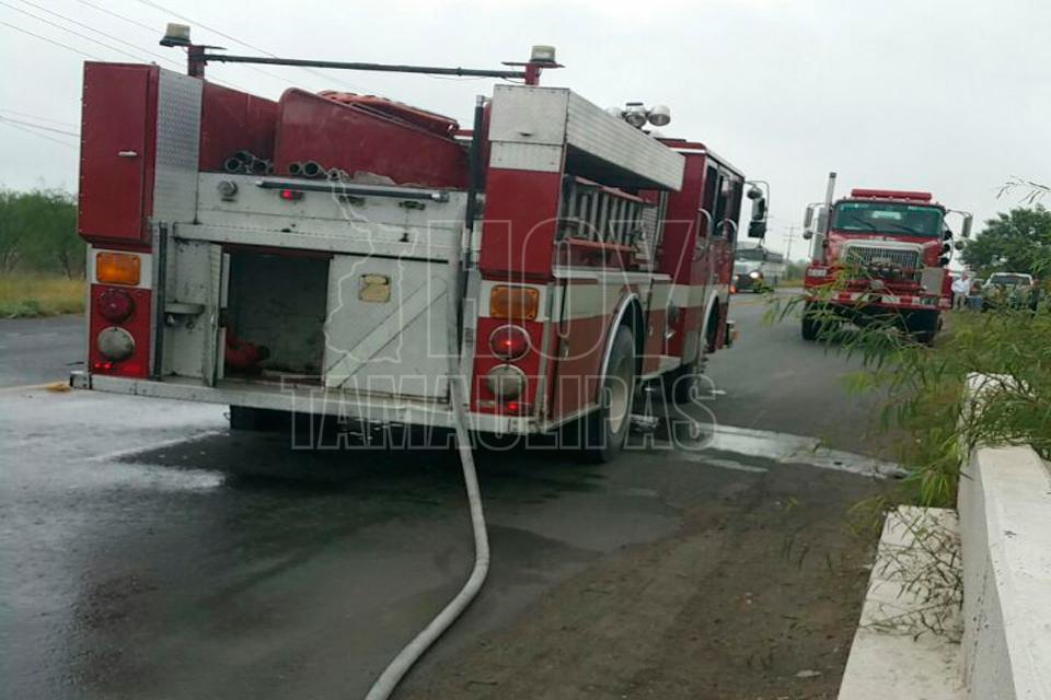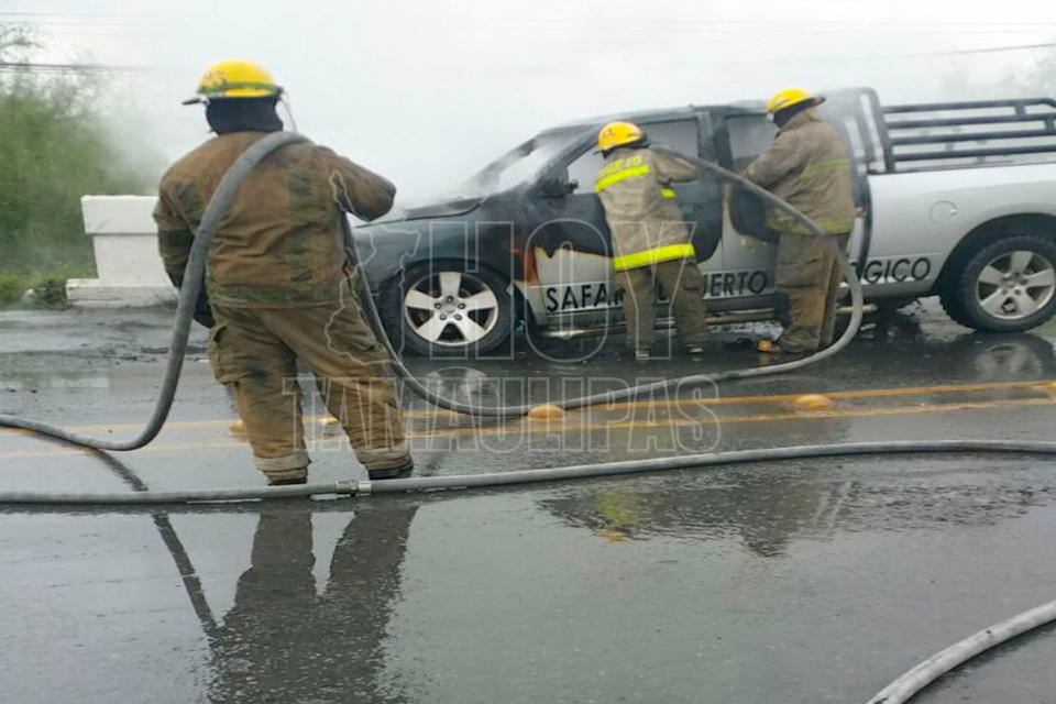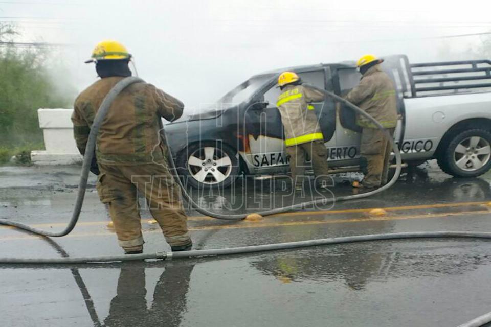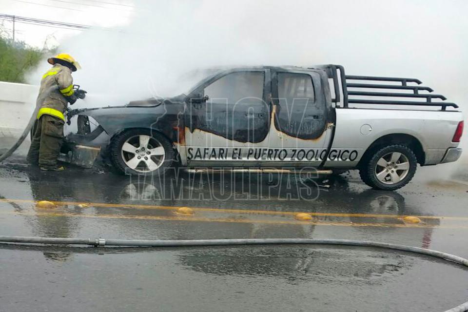 Una camioneta Pick Up que llevaba remolcando a otra unidad motriz en Reynosa quedó inservible, luego de que las llamas se apoderaron del motor a causa de un supuesto corto circuito.