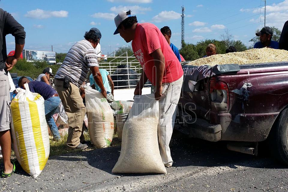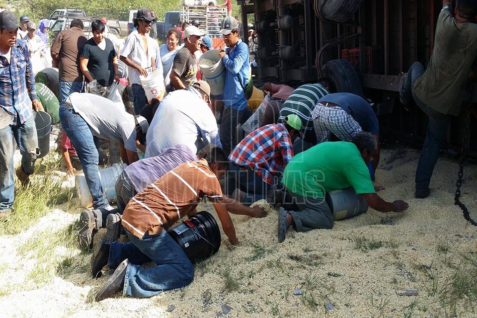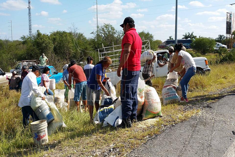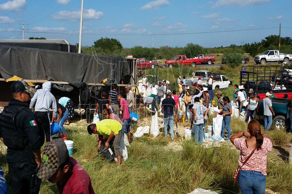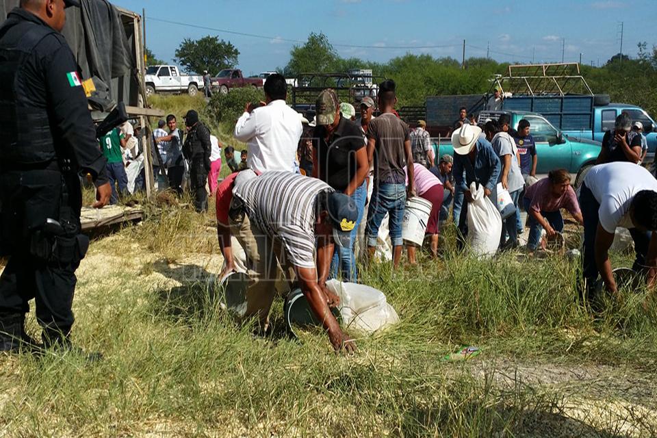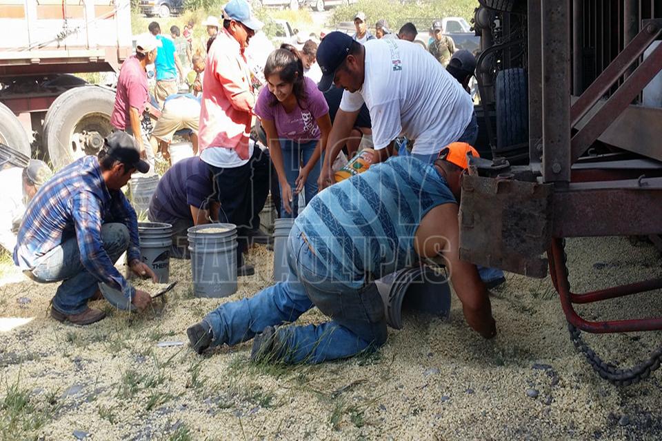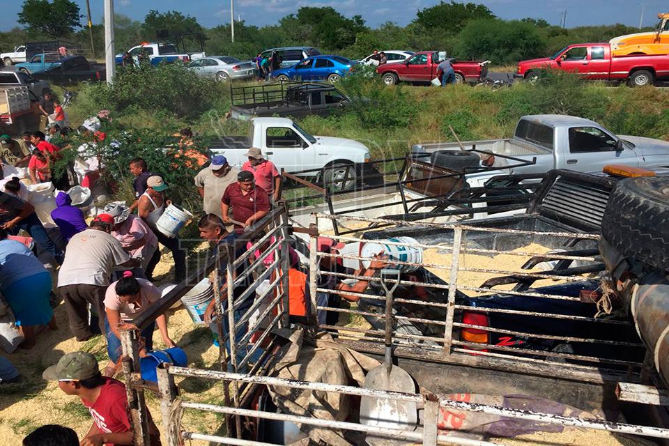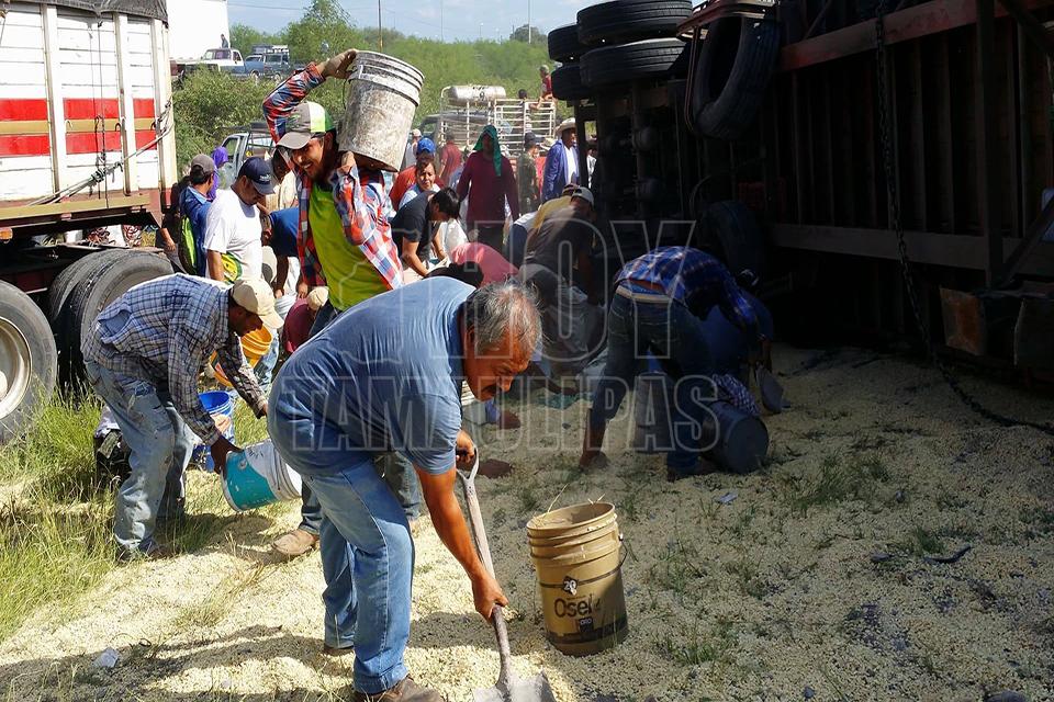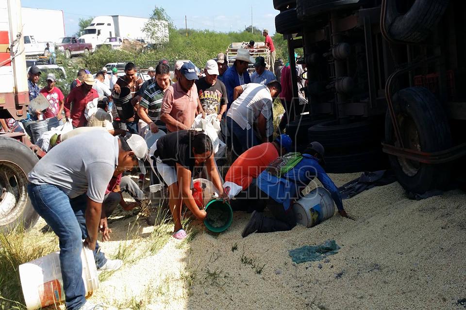 Después de la volcadura de un tractocamión del servicio público Federal en el kilómetro 10 de la carretera Soto la Marina, en la curva conocida como “La Curva de la Muerte”, se realizó una rapiña de maíz