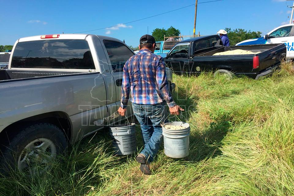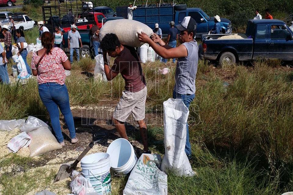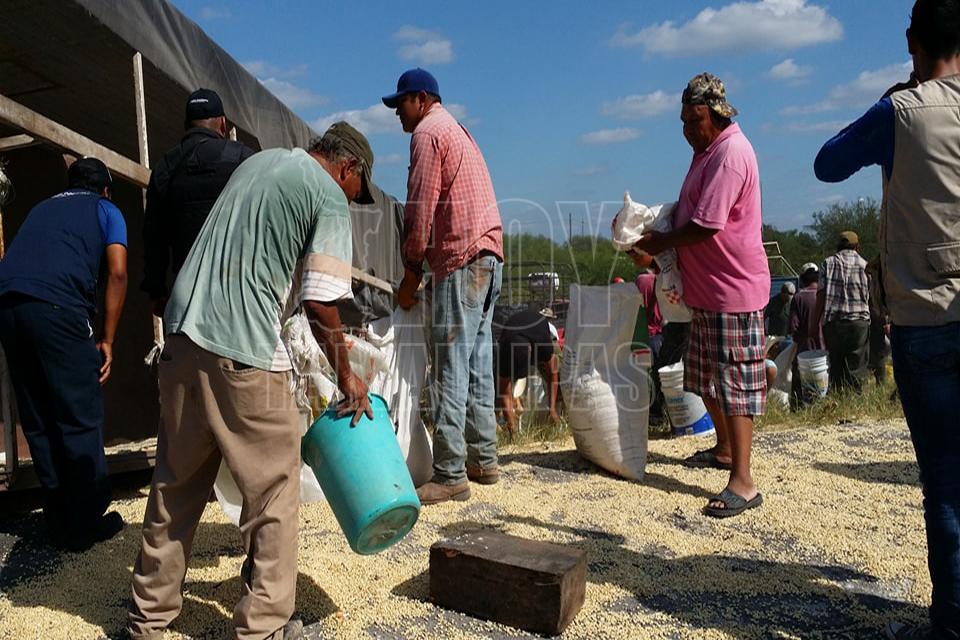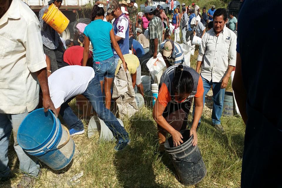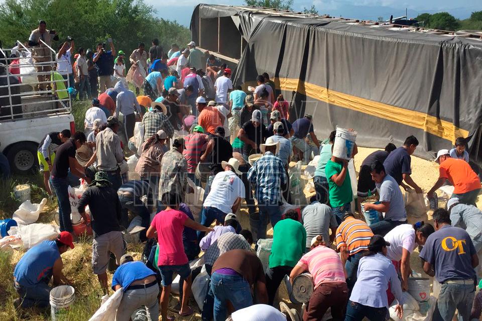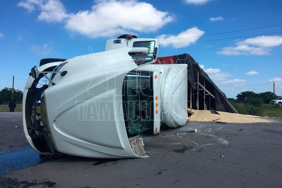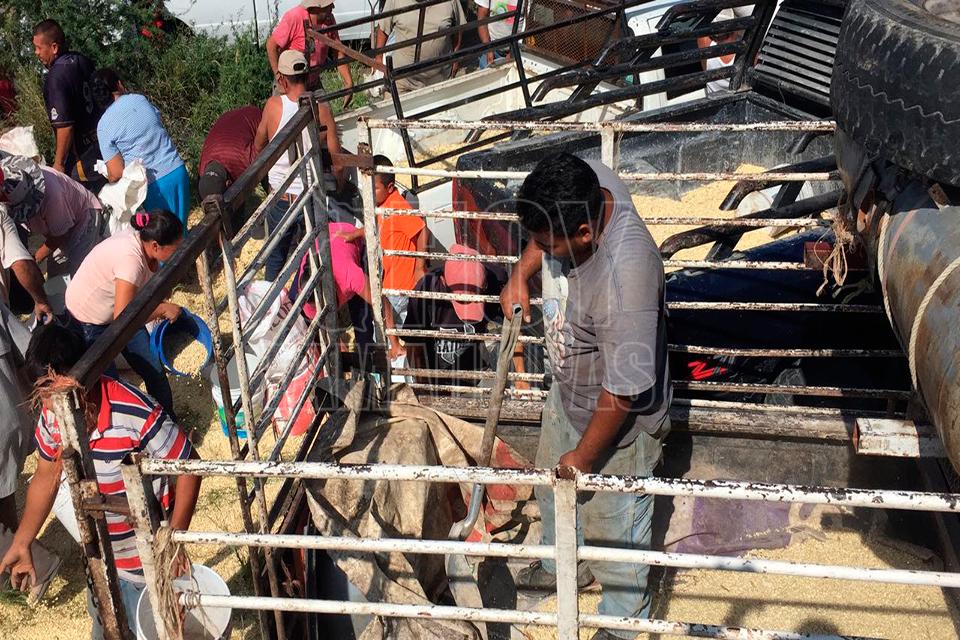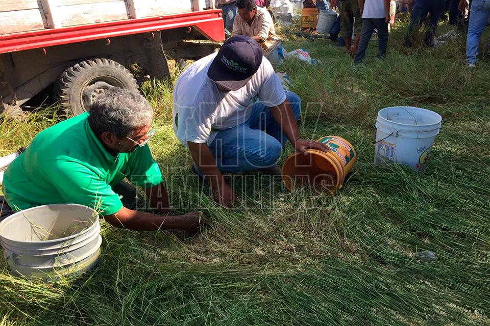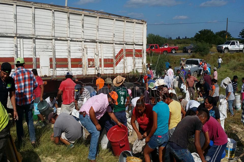 Después de la volcadura de un tractocamión del servicio público Federal en el kilómetro 10 de la carretera Soto la Marina, en la curva conocida como “La Curva de la Muerte”, se realizó una rapiña de maíz