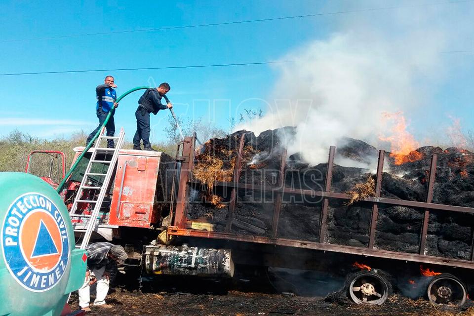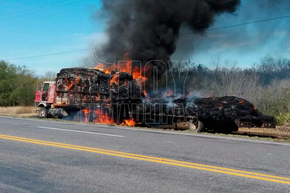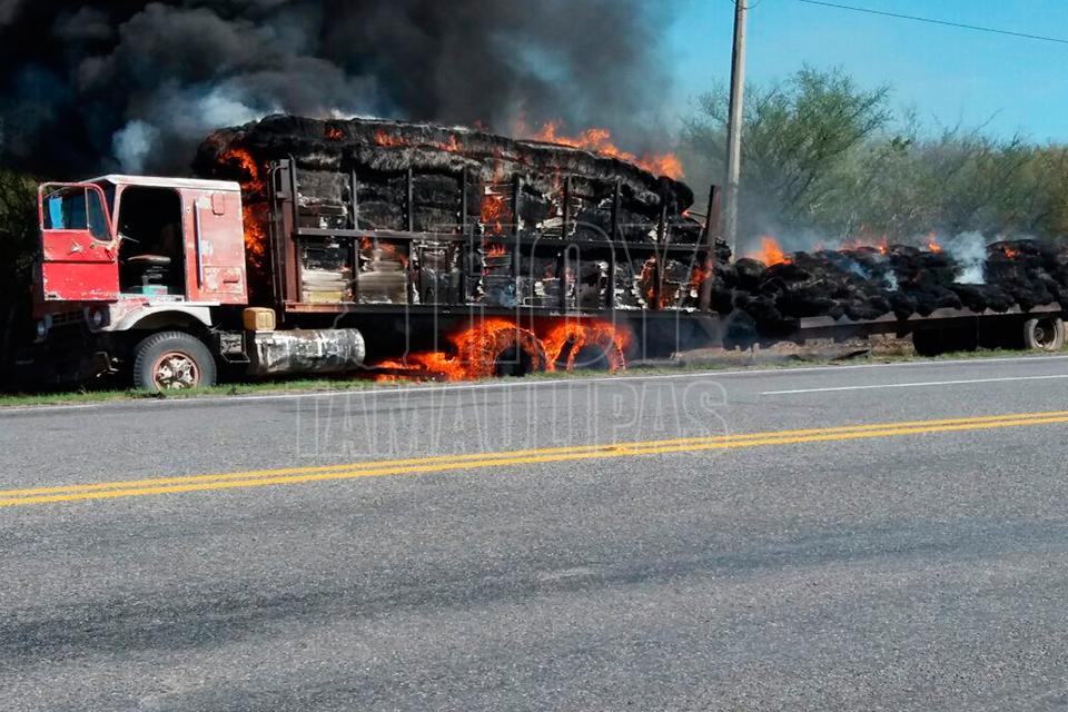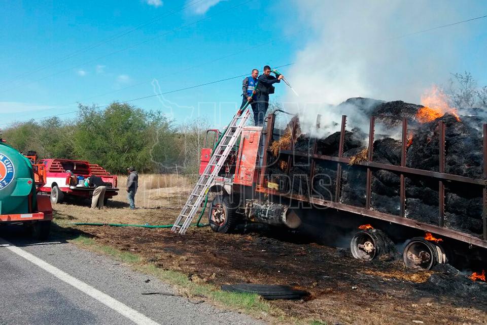 Un camión cargado con pacas de zacate se incendió en el kilómetro 67.5 de la carretera Ciudad Victoria – Matamoros, en el tramo carretero de Padilla y Jiménez.