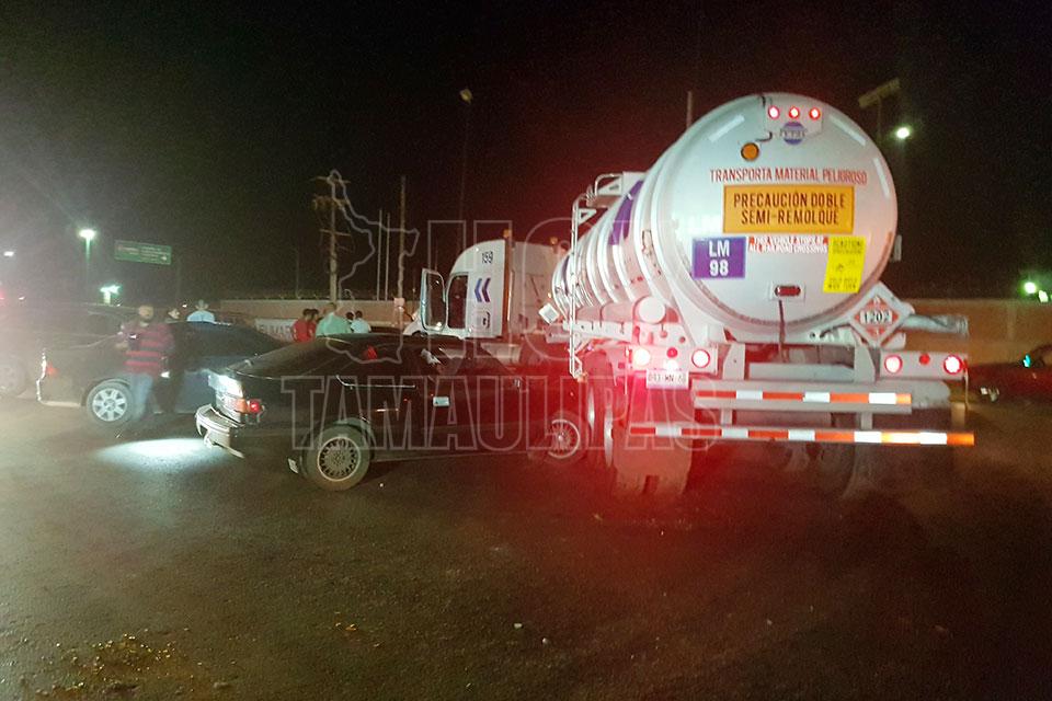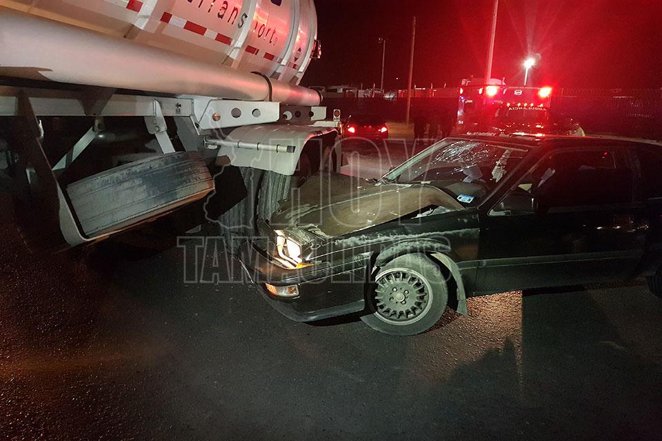 Cuatro jóvenes lesionados y daños materiales importantes fue el saldo de un encontronazo entre un tráiler-pipa y un auto compacto en la carretera al Aeropuerto, al poniente de Nuevo Laredo. El accidente ocurrió a las 9:00 de la noche en el cruce con la calle Miguel Trillo, frente a Petróleos Mexicano (Pemex)