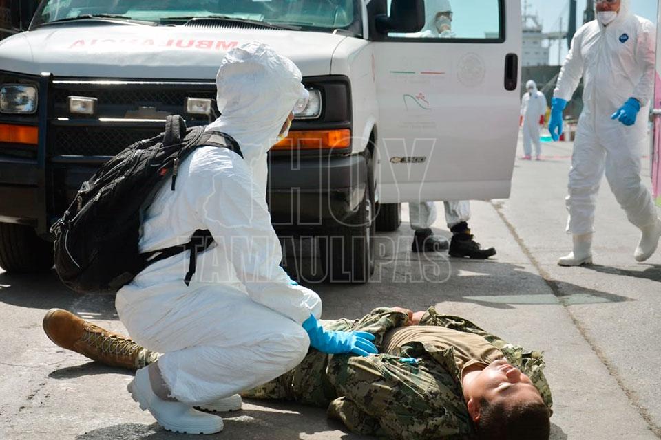 Tamaulipas se posicionó a la vanguardia internacional en materia de emergencias en salud pública al desplegar su capacidad de reacción y coordinación interinstitucional durante el simulacro de ataque bioterrorista que se realizó hoy en el puerto de Tampico