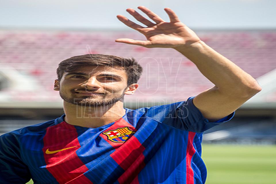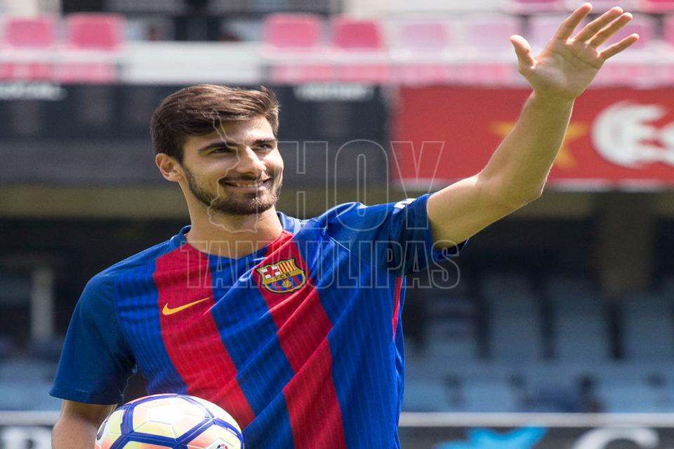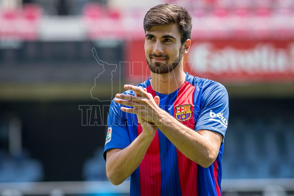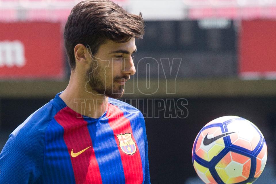 El jugador portugués André Gomes, es presentado por el presidente del FC Barcelona, Josep Maria Bartomeu, en el Camp Nou