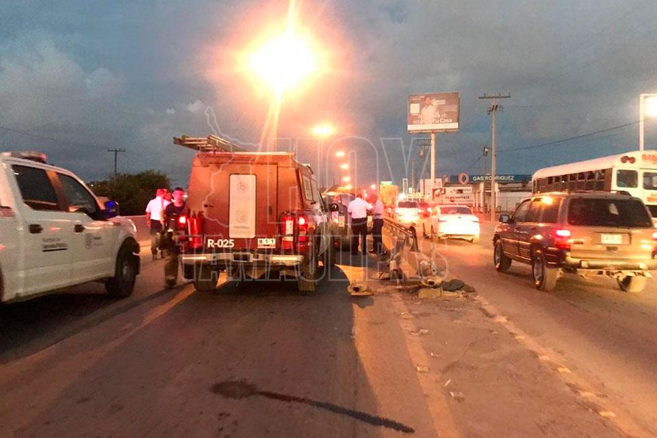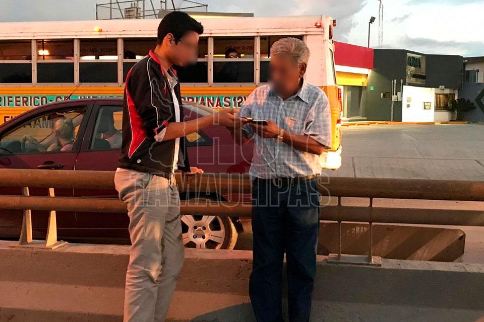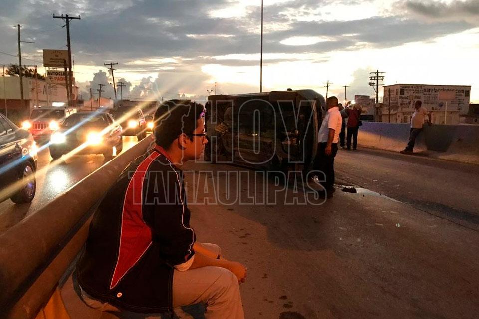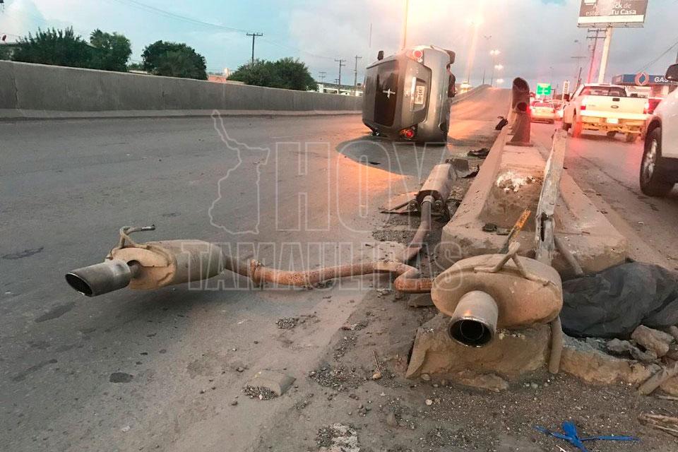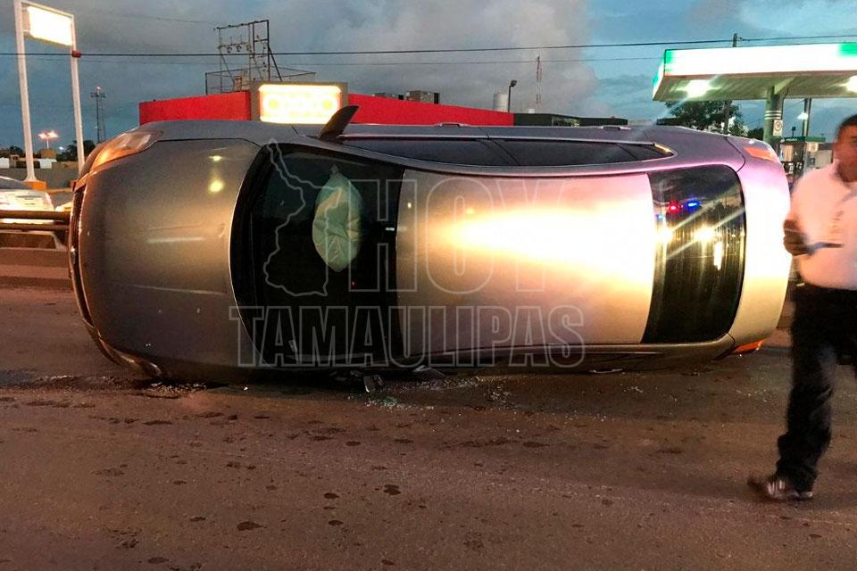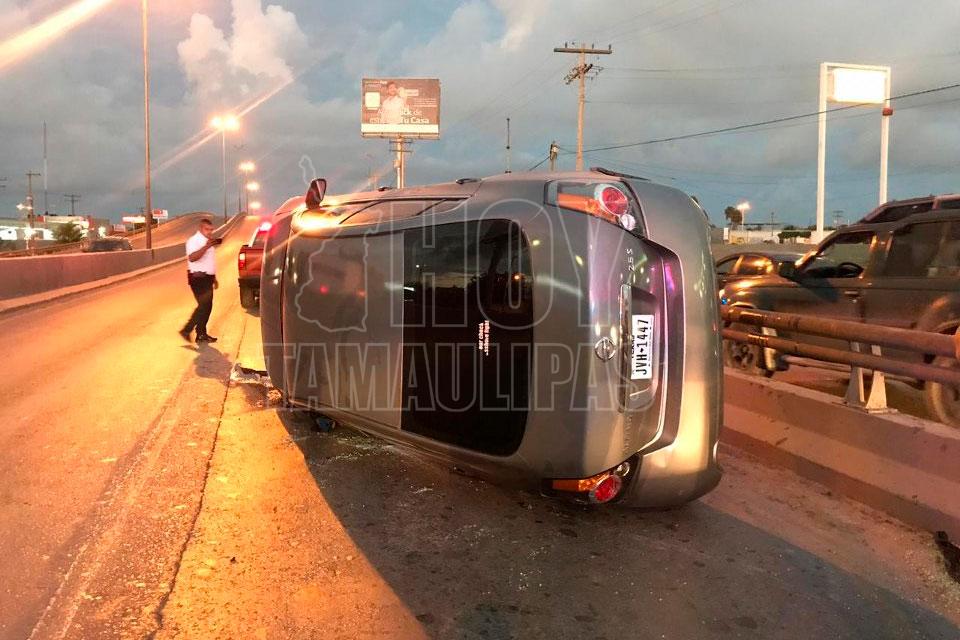 Un maestro jubilado que conducía un vehículo volcó esta mañana antes de subir un puente de una transitada Avenida de Matamoros, y para su buena fortuna él y su acompañante salieron ilesos
