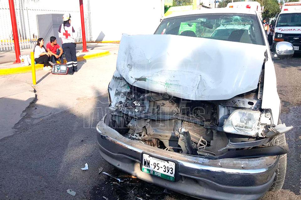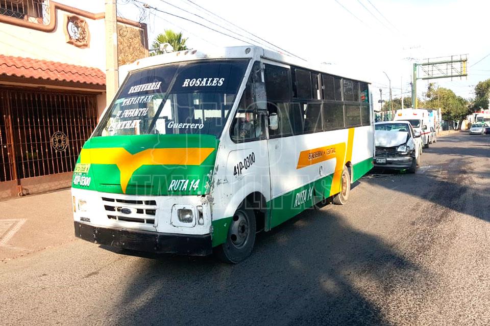 Tras el fuerte choque, cinco personas que iban de pasajeros en el microbús de la ruta 14 resultaron lesionadas y dos más que iban en la camioneta