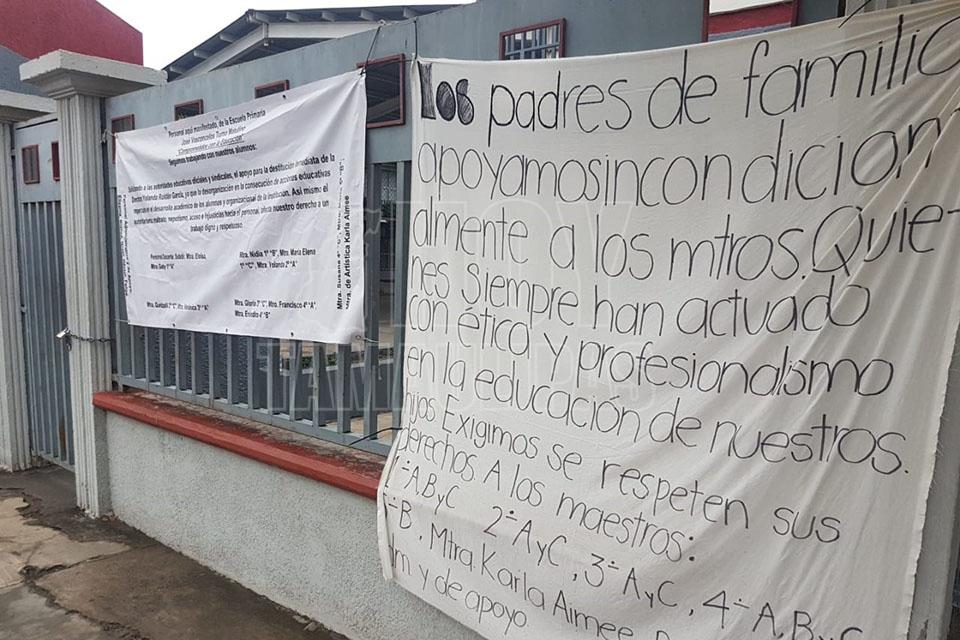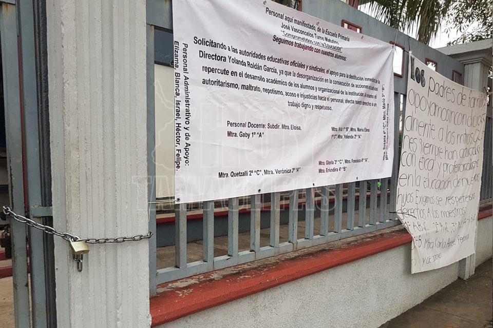 Un grupo de padres de familia cerraron con cadenas y candados las puertas de acceso a la Primaria José Vasconcelos en apoyo a los maestros que sufren maltrato y acoso laboral y para exigirle cuentas a la directora