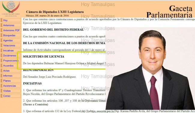 El diputado federal Baltazar Hinojosa Ochoa presentó la solicitud de licencia a su cargo como legislador federal, según revela la Gaceta Parlamentaria Por: Oficial: Baltazar Hinojosa Ochoa solicitó licencia en CongresoEn la Gaceta Parlamentaria para la sesión de este miércoles se establece el punto de solicitud de licencia