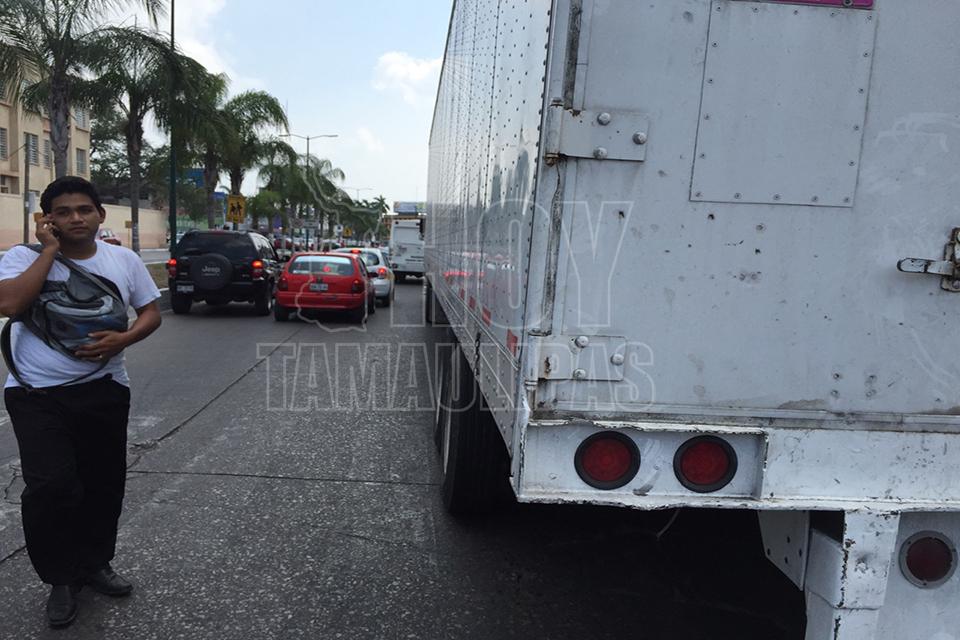 La situación empeora al ya saturado primer cuadro de la cuidad, además de que peatones tienen que pasar muy cerca de la caja del tráiler.
