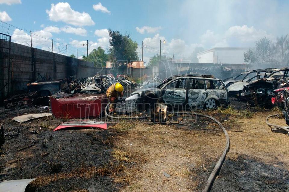 Reynosa, Tamaulipas.- Más de 16 vehículos y partes automotrices que estaban en un yonque de Reynosa quedaron bajo el fuego, luego de que los empleados estaban quemando basura y las llamas se salieron de control.