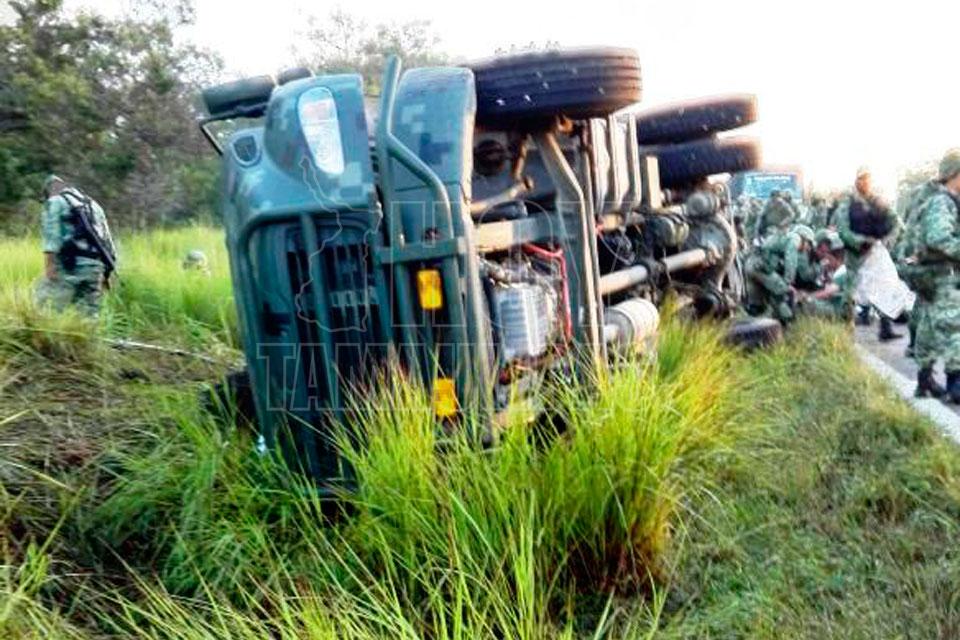 En ese punto, un camión del Ejército con 35 soldados a bordo se salió de la carpeta asfáltica y se volcó sobre uno de sus costados, ocasionando lesiones menores a 12 de los militares, quienes fueron trasladados por sus compañeros a un Hospital de Tampico.
