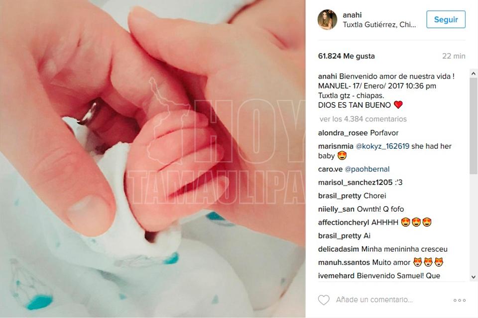 La cantante Anahí compartió en Instagram la primera imagen de su hijo y escribió: “Bienvenido amor de nuestra vida ! MANUEL- 17/ Enero/ 2017 10:36 pm”.