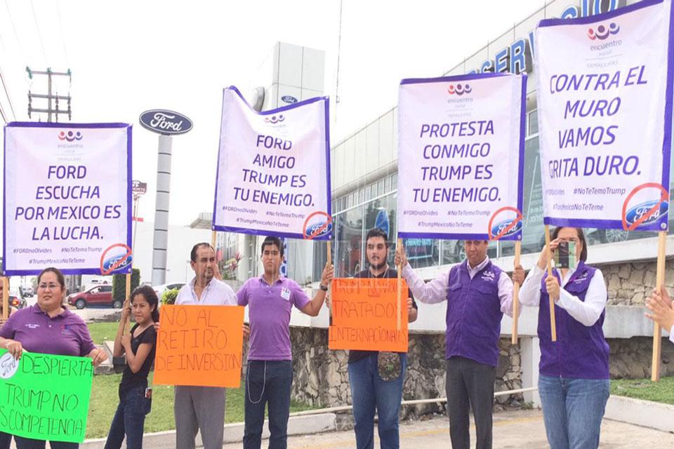 Con pancartas que decían Ford amigo Trump es tu enemigo y Ford escucha por México en la lucha, los manifestantes estuvieron alrededor de 40 minutos en el lugar.