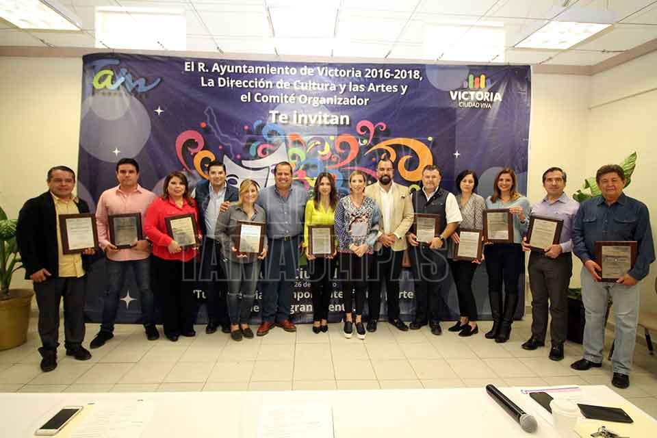 El Alcalde y su esposa, la señora Tony Sáenz de Almaraz, entregan reconocimientos a integrantes del Comité Organizador, quién jugó un papel fundamental en la realización de esta celebración que se realizará el próximo 24, 25 y 26 de Febrero y donde se presentarán los grupos Fievre Looka, Eliseo Robles y Banda El Recodo, así como miles de personas en carros alegóricos, comparsas y disfraces, toda la información se puede consultar en www.ciudadvictoria.gob.