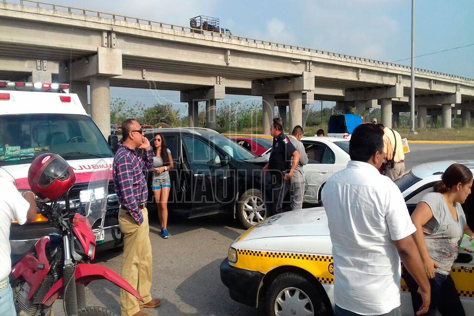 Altamira, Tamaulipas.- Un choque registrado entre el conductor de un taxi y la de una camioneta en transitado crucero del acceso al sector La Pedrera en Altamira, arrojó como saldo dos menores de edad y dos mujeres heridos.