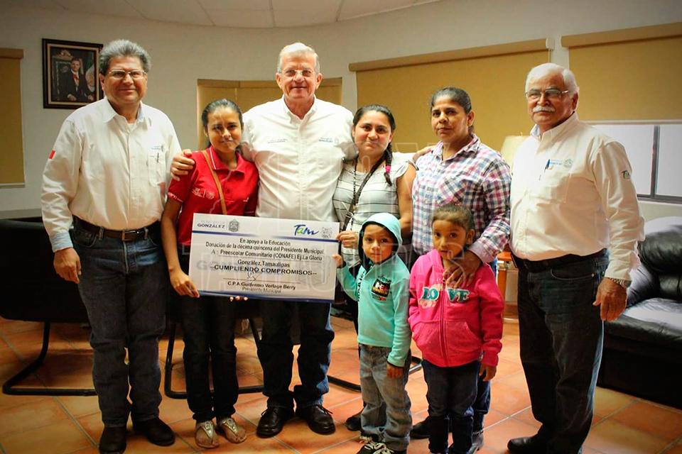 González, Tamaulipas.- Como parte de un compromiso pero a la vez en busca del fortalecimiento del sector educativo, el presidente Municipal, Guillermo Verlage Bery, donó una quincena más de su salario en beneficio de una escuela, esta vez, la del Ejido La Gloria que trabaja bajo el sistema del Consejo Nacional de Fomento Educativo.