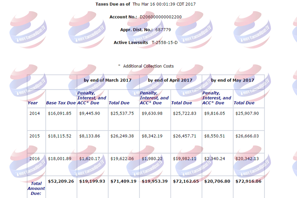Por otra parte la propiedad en McAllen, según otro documento al que se tuvo acceso, tiene un adeudo por predial por el orden de los 71 mil 409 dólares al mes de marzo, luego de presentar adeudos desde el 2014.