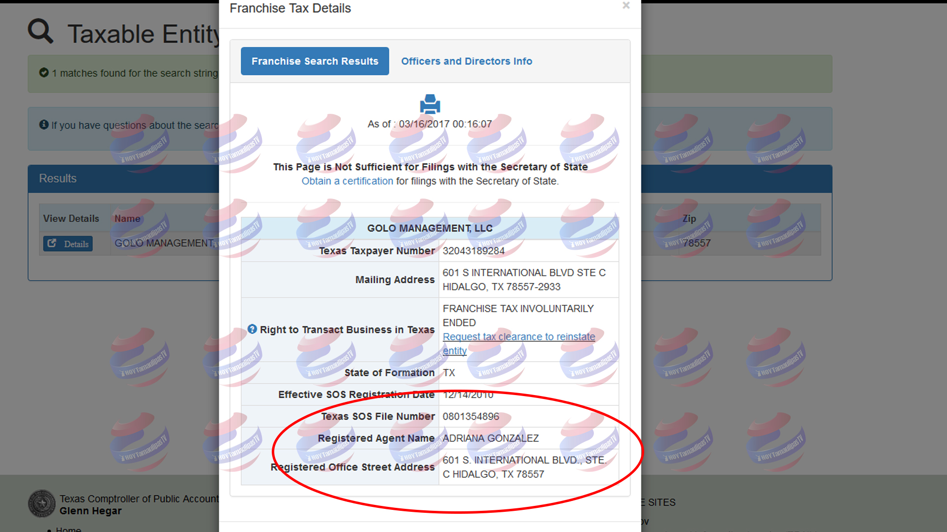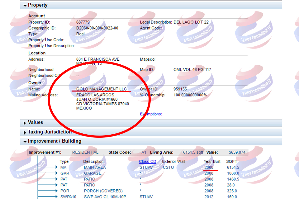 En una investigación de HOYTamaulipas, se pudo determinar que la propiedad ubicada en la Avenida Francisca con el número 801 en McAllen, Texas su último propietario es Golo Management LLC, misma que tiene un valor de 860,874 dólares y en esta compañía aparece Adriana González como representante legal, además que cuenta con domicilio para recibir correspondencia en Juan O Doria No. 1660 en Fraccionamiento Los Arcos en Ciudad Victoria, Tamaulipas.