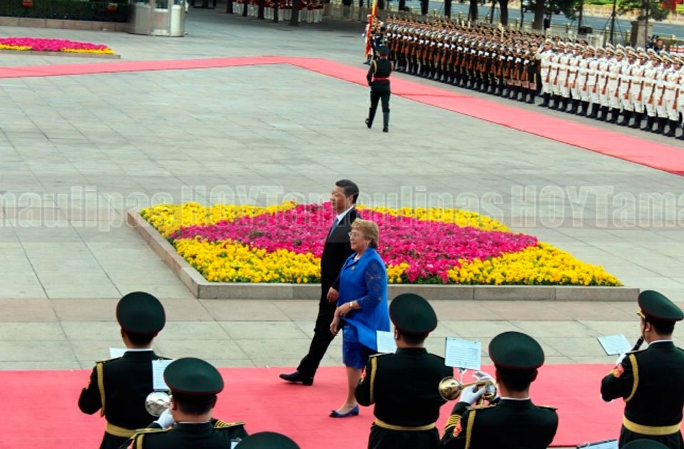 Bachelet, quien llegó el viernes a la capital china procedente de Indonesia, llegó a las afueras del Gran Palacio del Pueblo en una limosina negra, tras descender del auto saludó al presidente Xi, y jutos saludaron a las delegaciones de los dos países.