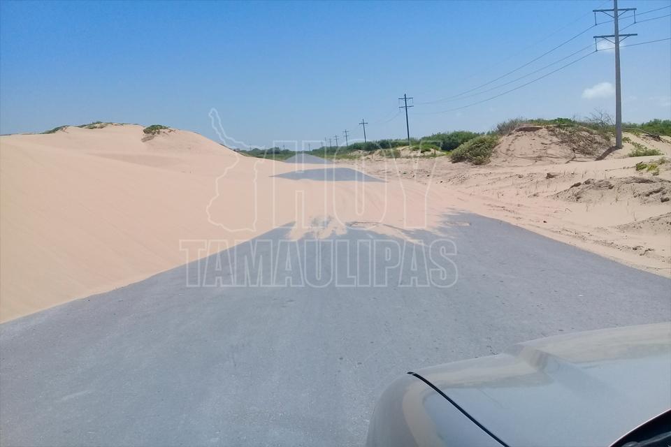 Es a la altura del kilómetro 59 al acceso al poblado Higuerillas al sur de Matamoros donde se aprecia la arena sobre la carretera, poniendo en riesgo a los automovilistas.