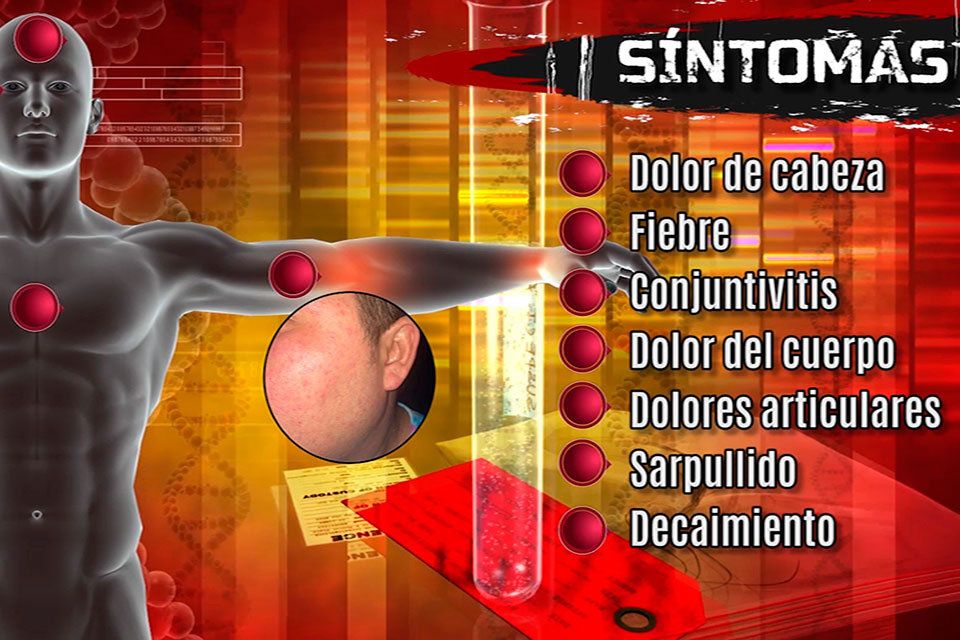En dolor de cabeza, fiebre, conjuntivitis, dolor del cuerpo, dolores articulares, sarpullido, decaimiento e inflamación de miembros inferiores.