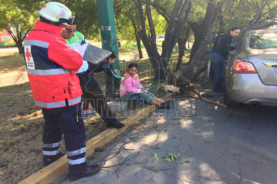 Ciudad Victoria, Tamaulipas.- Dos mujeres resultaron lesionadas luego de que un árbol cayó sobre el parabrisas del automóvil en el que viajaban, hechos ocurridos esta mañana frente a la tienda Soriana Palmas en Ciudad Victoria.
