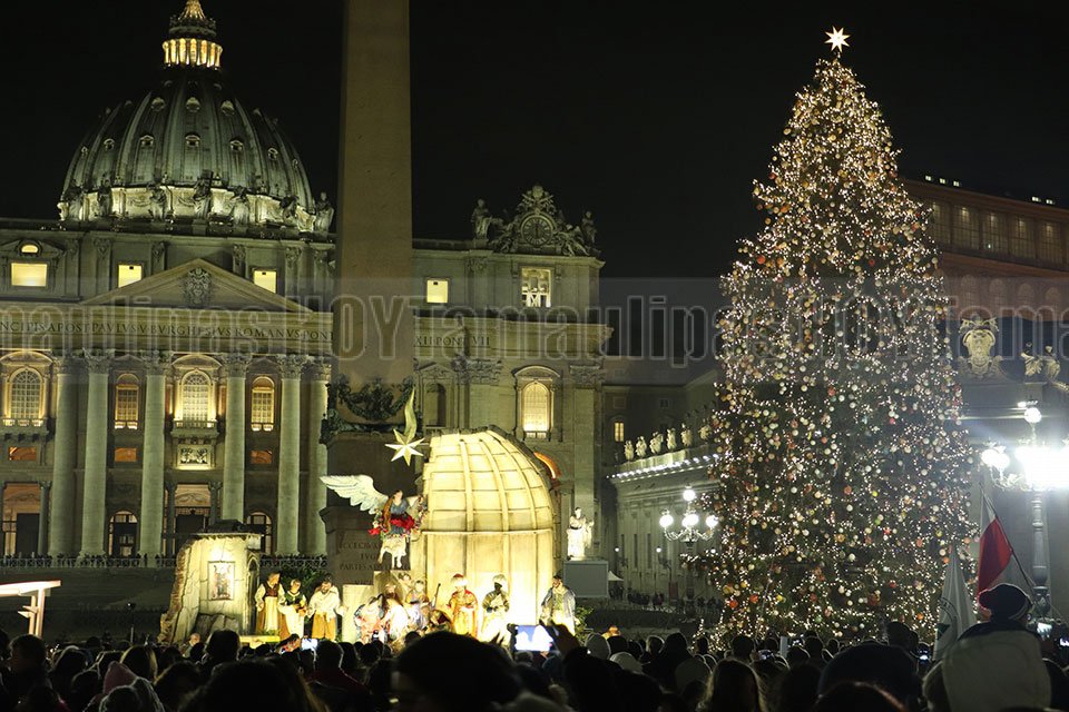 Ciudad del Vaticano, (Notimex).- Al ritmo de villancicos como “Venid adoremos” y con el recitado de algunos poemas, se iluminó el árbol de Navidad gigante y el nacimiento de tamaño natural, ambos colocados en el centro de la Plaza de San Pedro.