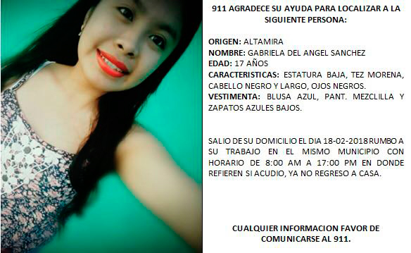 Altamira, Tamaulipas.- Autoridades solicitan la ayuda de la ciudadanía para localizar a una adolescente de 17 años de edad, quien desapareció después de salir de su trabajo en Altamira.