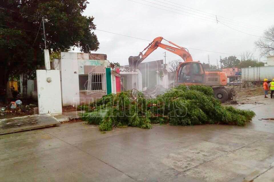En una foto que subió a su cuenta se observa como maquinaria pesada derrumbó un árbol y las oficinas de Revolucionario Institucional.