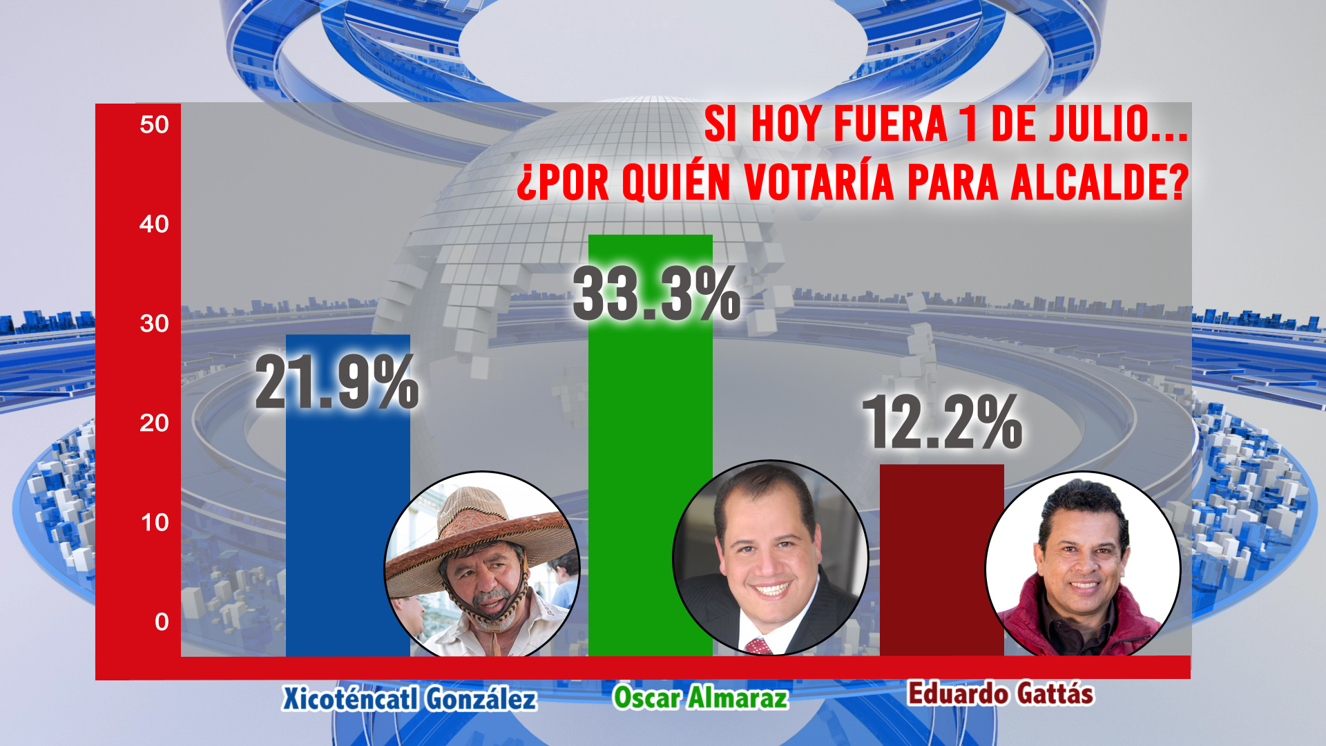 Es importante indicar que los resultados expuestos son considerados “brutos”, en la preferencia efectiva, excluyendo la información del valor “no deseo responder”, el priísta Oscar Almaraz sube a 35.75% y Xicoténcatl González estaría en el 23.46%.
