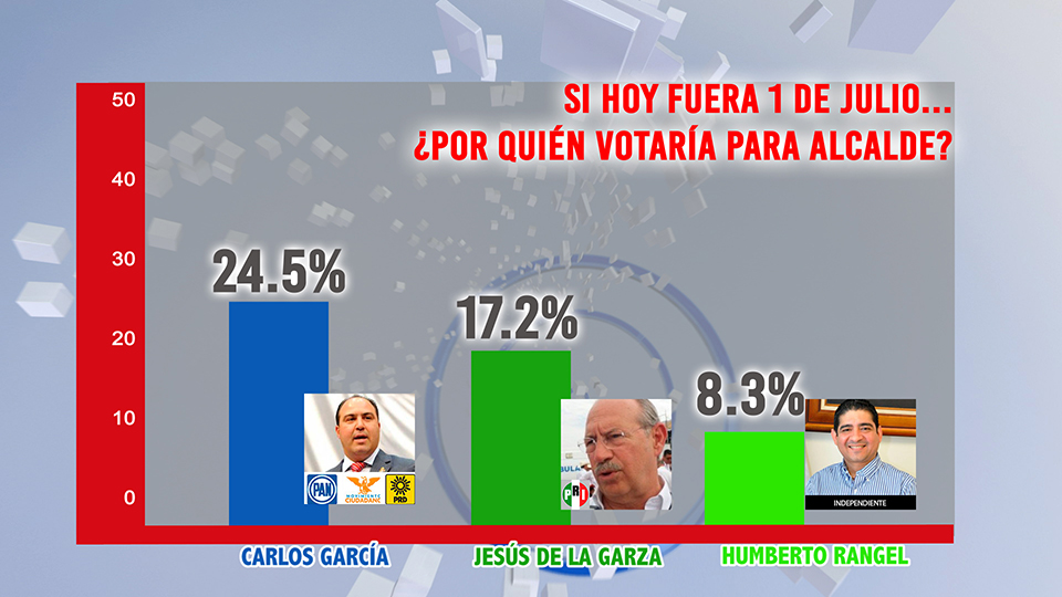 Matamoros, Tamaulipas.- El panista Carlos García González, quien encabeza la coalición “Por Tamaulipas al Frente”, ganaría con un amplio margen la alcaldía de Matamoros, según los resultados de la encuesta realizada por Marketing & Estrategias en esta ciudad fronteriza.