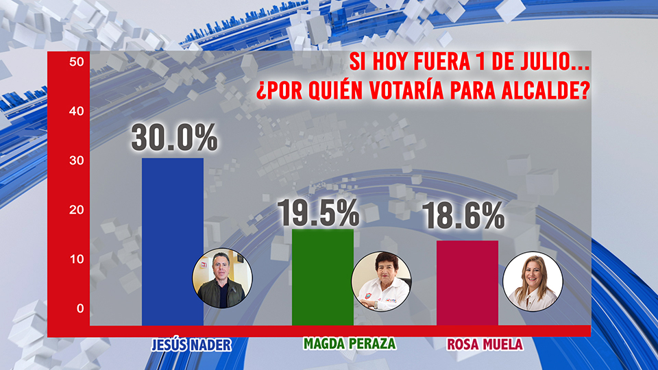 Los resultados de la encuesta indican que Jesús Nader obtendría el 30 por ciento de las preferencias contra el 19.5 que tendría la profesora Magdalena Peraza Guerra y el 18.6 que le dan a la abanderada de Juntos Haremos Historia, Rosa Muela.