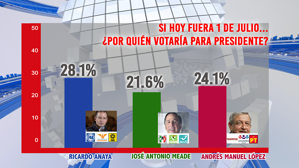 En la variable sobre la elección presidencial, Ricardo Anaya de la coalición Por México al Frente obtendría el 28.1 por ciento, siguiéndole Andrés Manuel López Obrador con el 24.1 por ciento y José Antonio Meade con el 21.6 por ciento.